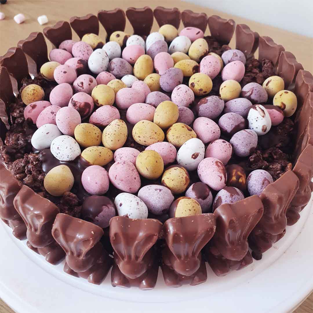 - Using a little bit of melted milk chocolate, stick the Malteser bunnies to around the outside of the cake