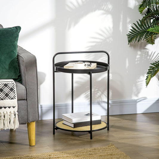 Homcom End Table 2-Tier Round Side Table With Detachable Tray & Plastic Rattan Shelf