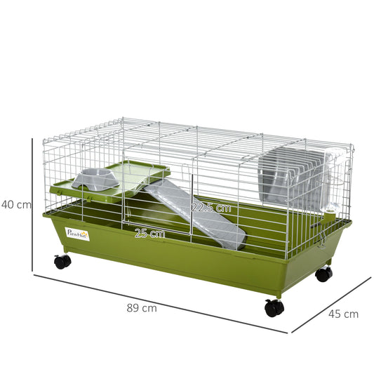 PawHut Small Animal Cage Rabbit Guinea Pigs Chinchillas Cage w/ Wheels Water Bottle Food Dish Platform Ramp 89 x 44 x 43 cm Green