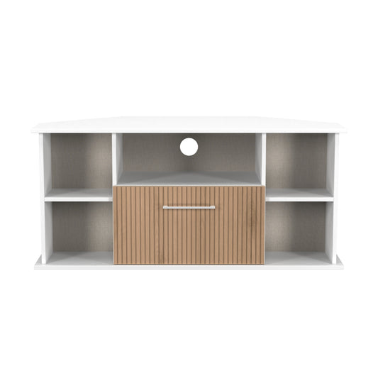 Worcester Corner Corner TV Unit White & Light Oak 5 Shelves 1 Drawer 110cm