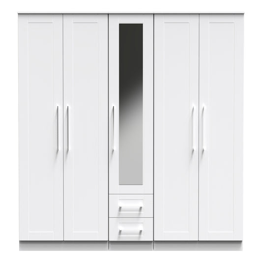 York Tall Mirror Wardrobe White 5 Doors 2 Shelves 2 Drawers 185cm