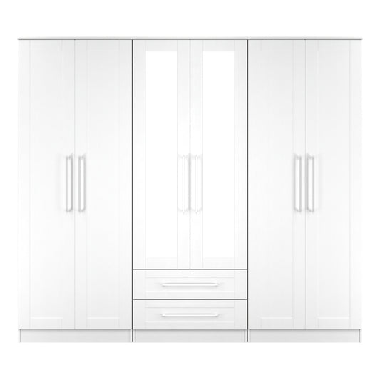 York Tall Mirror Wardrobe White 6 Doors 2 Shelves 2 Drawers 222cm
