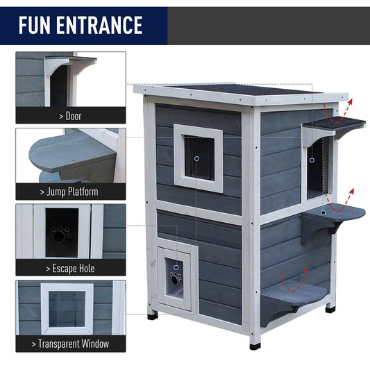 PawHut Wooden Cat House 2-Floor Outdoor Kitten Shelter with Window Grey