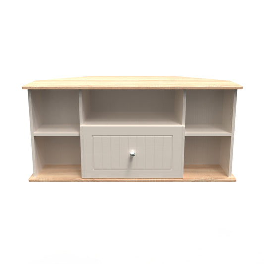 Worcester Corner Corner TV Unit White & Light Oak 5 Shelves 1 Drawer 110cm