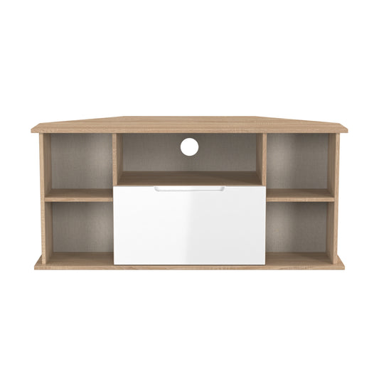 Milan Corner Corner TV Unit White & Oak 5 Shelves 1 Drawer 110cm