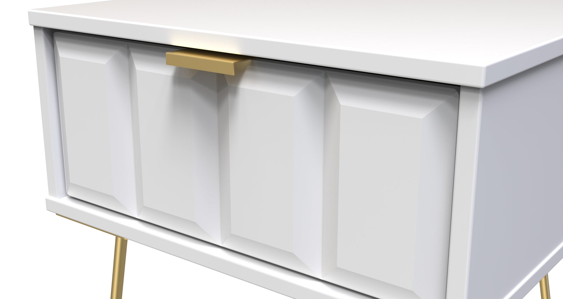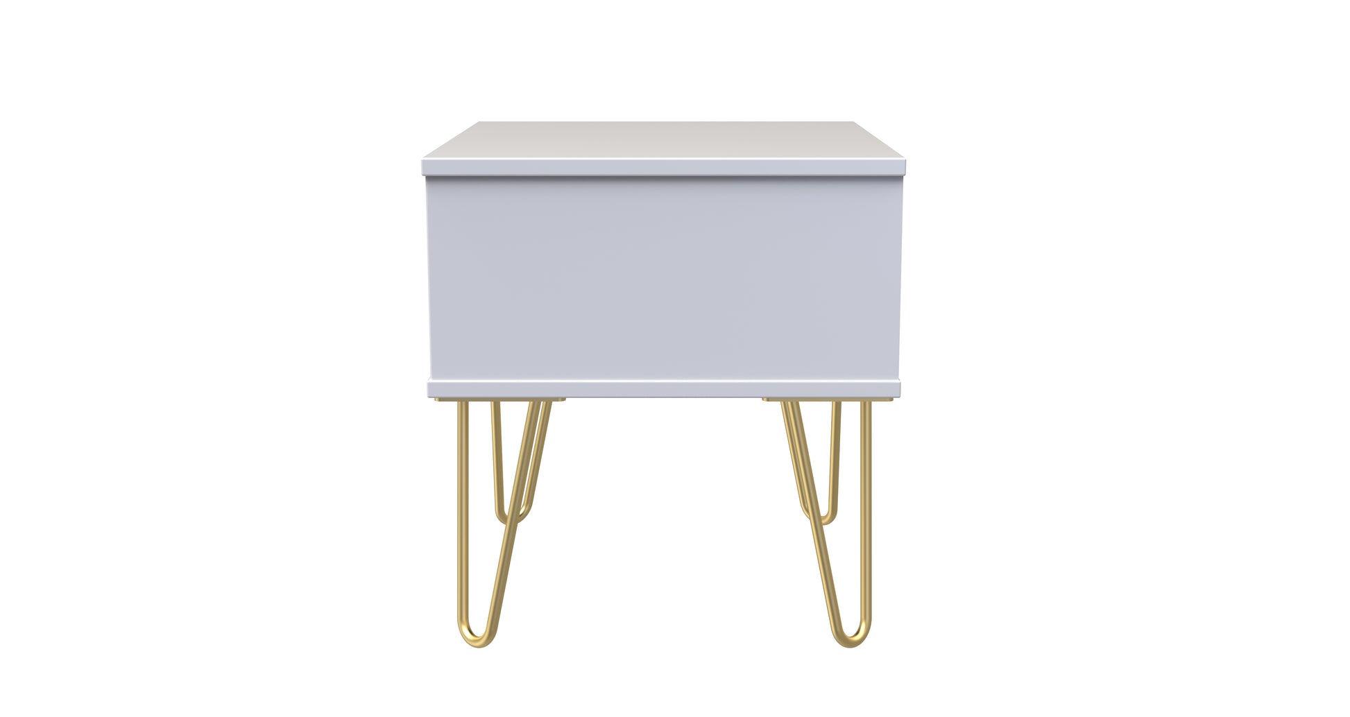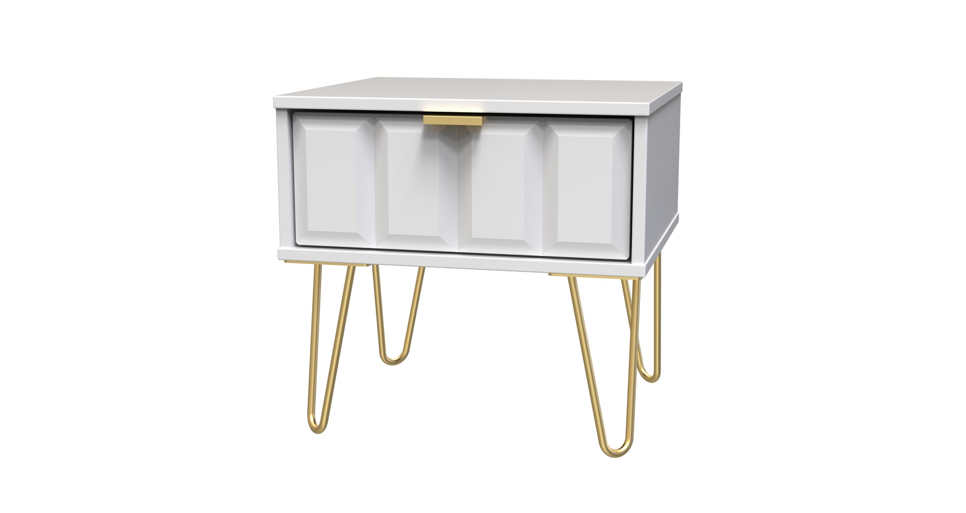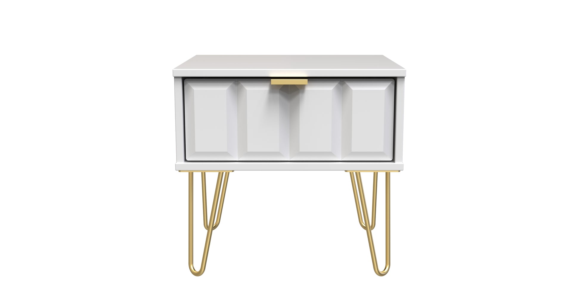 This single drawer low level bedside cabinet is practical and stylish. Perfect for any bedside or as a free standing storage unit. A modern and distinctive range. This ranges unique aesthetic is best represented by the distinctive "Cube" patten of the drawer and door fronts. Also features Gold Metal Handles and Gold Hairpin Legs. Comes in a wide range of colours including eye cathching two tone colour combinations. All our furniture is made to order in the United Kingdom, to the highest quality. It is delivered within 10 working days direct to your location of choice by one of our two man delivery teams, and comes fully assembled (although legs may be removed to prevent damage in transit). Part of the Cube Collection.