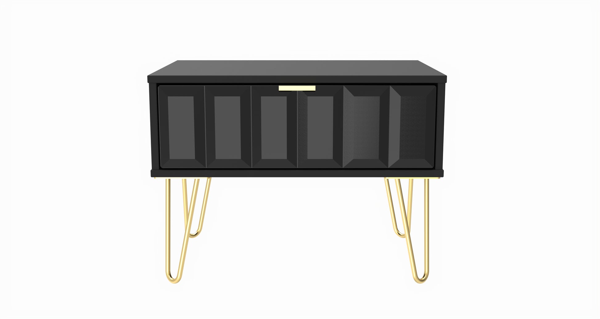 This single drawer bedside cabinet is wider than normal for added practicality. Perfect for any bedside or as a free standing storage unit. A modern and distinctive range. This ranges unique aesthetic is best represented by the distinctive "Cube" patten of the drawer and door fronts. Also features Gold Metal Handles and Gold Hairpin Legs. Comes in a wide range of colours including eye cathching two tone colour combinations. All our furniture is made to order in the United Kingdom, to the highest quality. It is delivered within 10 working days direct to your location of choice by one of our two man delivery teams, and comes fully assembled (although legs may be removed to prevent damage in transit). Part of the Cube Collection.