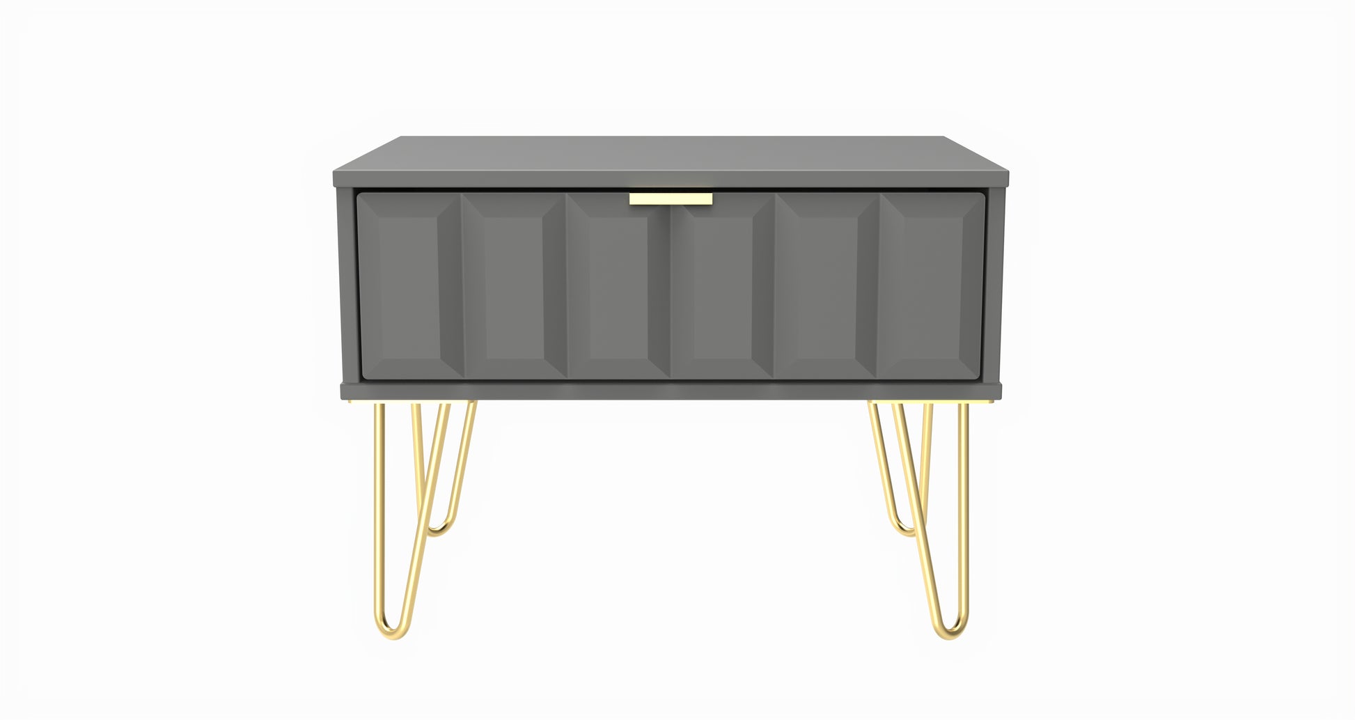 This single drawer bedside cabinet is wider than normal for added practicality. Perfect for any bedside or as a free standing storage unit. A modern and distinctive range. This ranges unique aesthetic is best represented by the distinctive "Cube" patten of the drawer and door fronts. Also features Gold Metal Handles and Gold Hairpin Legs. Comes in a wide range of colours including eye cathching two tone colour combinations. All our furniture is made to order in the United Kingdom, to the highest quality. It is delivered within 10 working days direct to your location of choice by one of our two man delivery teams, and comes fully assembled (although legs may be removed to prevent damage in transit). Part of the Cube Collection.
