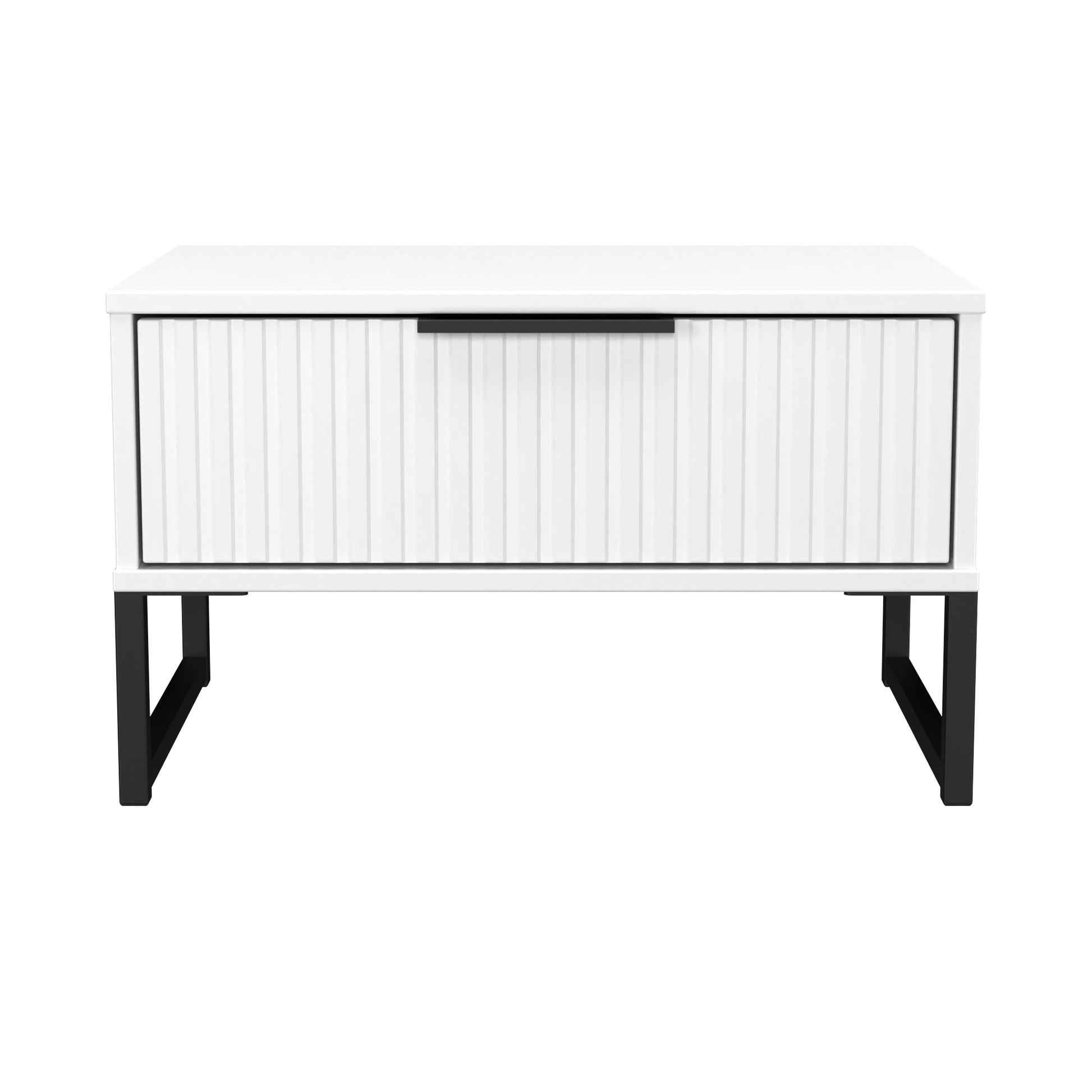 This single drawer bedside cabinet is wider than normal for added practicality. Perfect for any bedside or as a free standing storage unit. A new stand out range, with its new deep cut "fluted" grove patten of the drawer and door fronts. Featuring black metal handles and black sleigh legs. A striking and individual range that is perfect for the modern home. All our furniture is made to order in the United Kingdom, to the highest quality using responsibly sourced materials. It is delivered within 10 working days direct to your location of choice by one of our two man delivery teams, and comes fully assembled (although items with legs will have those legs removed during transit to avoid damage). Part of the Fluted Collection.