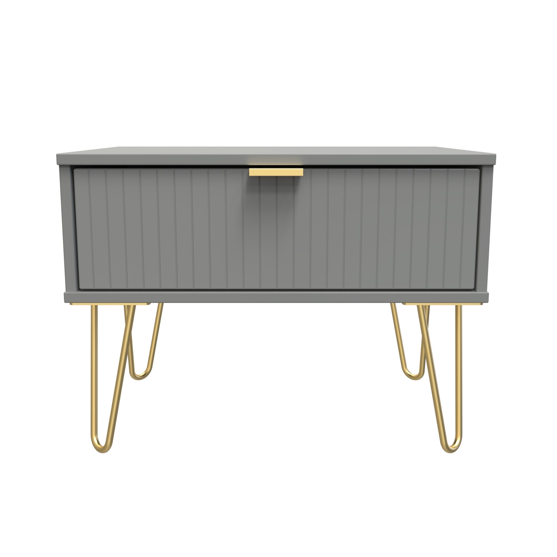 This single drawer bedside cabinet is wider than normal for added practicality. Perfect for any bedside or as a free standing storage unit. A modern and distinctive range. This ranges unique aesthetic is best represented by the distinctive "Linear" patten of the drawer and door fronts. Also features Gold Metal Handles and Gold Hairpin Legs. Comes in a wide range of colours including eye cathching two tone colour combinations. All our furniture is made to order in the United Kingdom, to the highest quality. It is delivered within 10 working days direct to your location of choice by one of our two man delivery teams, and comes fully assembled (although legs may be removed to prevent damage in transit). Part of the Linear Collection.
