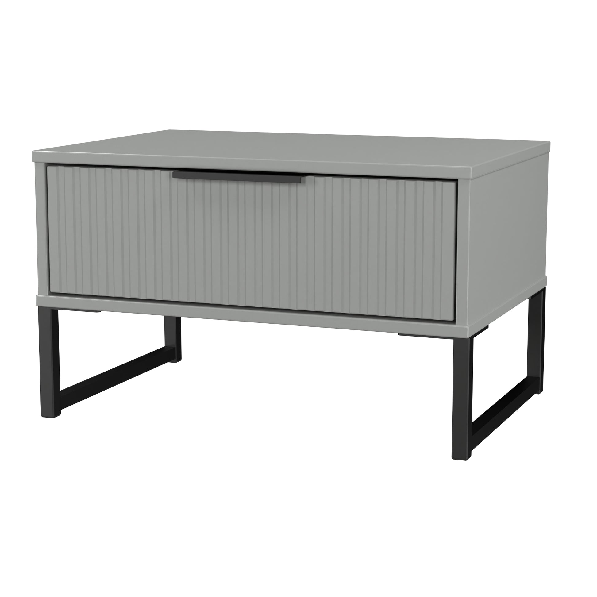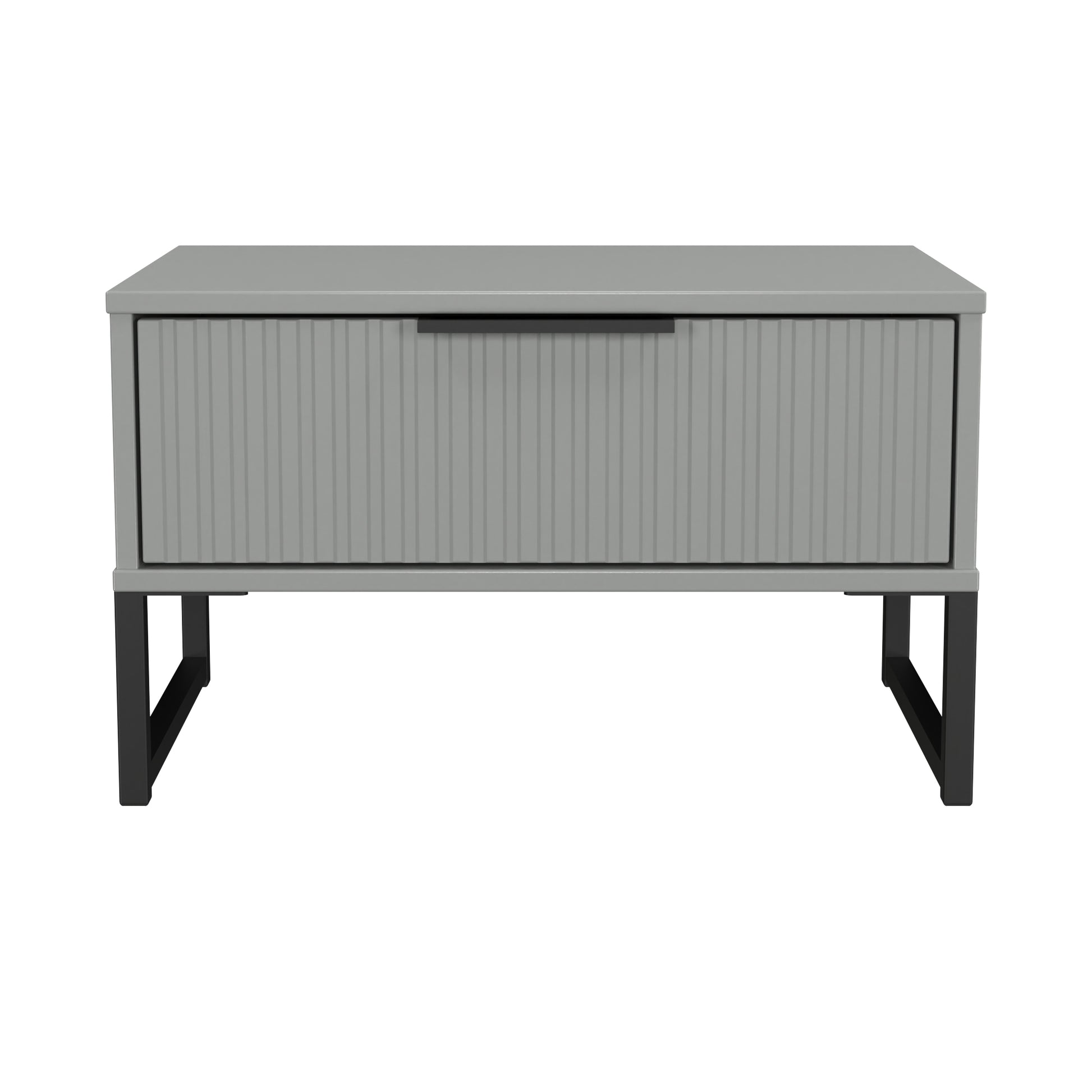 This single drawer bedside cabinet is wider than normal for added practicality. Perfect for any bedside or as a free standing storage unit. A new stand out range, with its new deep cut "fluted" grove patten of the drawer and door fronts. Featuring black metal handles and black sleigh legs. A striking and individual range that is perfect for the modern home. All our furniture is made to order in the United Kingdom, to the highest quality using responsibly sourced materials. It is delivered within 10 working days direct to your location of choice by one of our two man delivery teams, and comes fully assembled (although items with legs will have those legs removed during transit to avoid damage). Part of the Fluted Collection.