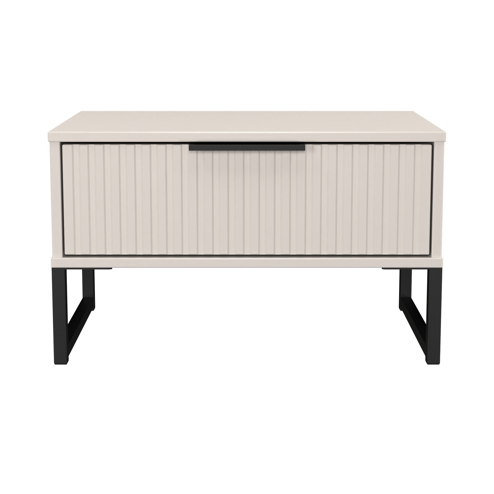 This single drawer bedside cabinet is wider than normal for added practicality. Perfect for any bedside or as a free standing storage unit. A new stand out range, with its new deep cut "fluted" grove patten of the drawer and door fronts. Featuring black metal handles and black sleigh legs. A striking and individual range that is perfect for the modern home. All our furniture is made to order in the United Kingdom, to the highest quality using responsibly sourced materials. It is delivered within 10 working days direct to your location of choice by one of our two man delivery teams, and comes fully assembled (although items with legs will have those legs removed during transit to avoid damage). Part of the Fluted Collection.