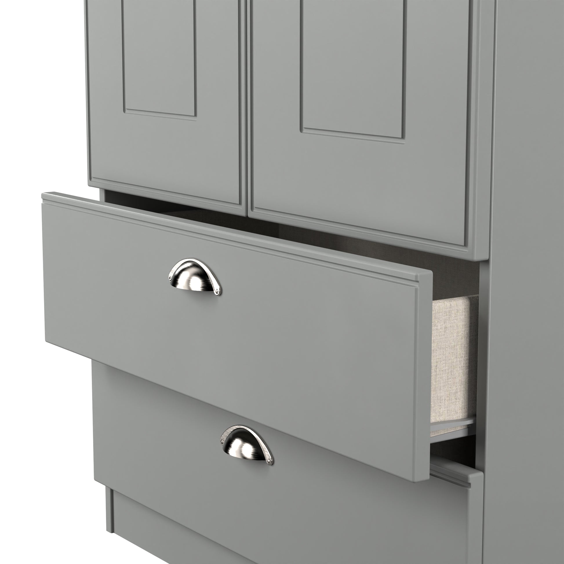 This full height double door wardrobe is perfect for any bedroom. Features the added practicality of 2 full width drawers. It's easy to create a bedroom that showcases effortless chic, with this stylish range. The shaker-inspired design exudes understated luxury, each piece is finished in a number of colours with brushed steel handles and the option of a contrasting oak effect top. A well-thought-out mix of hanging and flat storage that's suitable for any room. All our furniture is made to order in the United Kingdom, to the highest quality. It is delivered within 10 working days direct to your location of choice by one of our two man delivery teams, and comes fully assembled (although legs may be removed to prevent damage in transit). Part of the Victoria Collection.