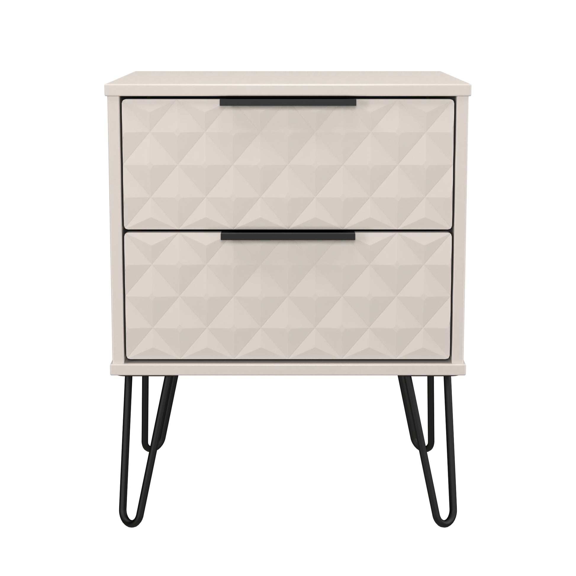 This compact 2 drawer bedside cabinet is practical and stylish. Perfect for any bedside or as a free standing storage unit. A modern and distinctive range. This ranges unique aesthetic is best represented by the distinctive "Harlequin" patten of the drawer and door fronts. Also features Black Metal Handles and Black Hairpin Legs. Comes in a wide range of colours including eye cathching two tone colour combinations. All our furniture is made to order in the United Kingdom, to the highest quality using responsibly sourced materials. It is delivered within 10 working days direct to your location of choice by one of our two man delivery teams, and comes fully assembled (although items with legs will have those legs removed during transit to avoid damage). Part of the Harlequin Collection.