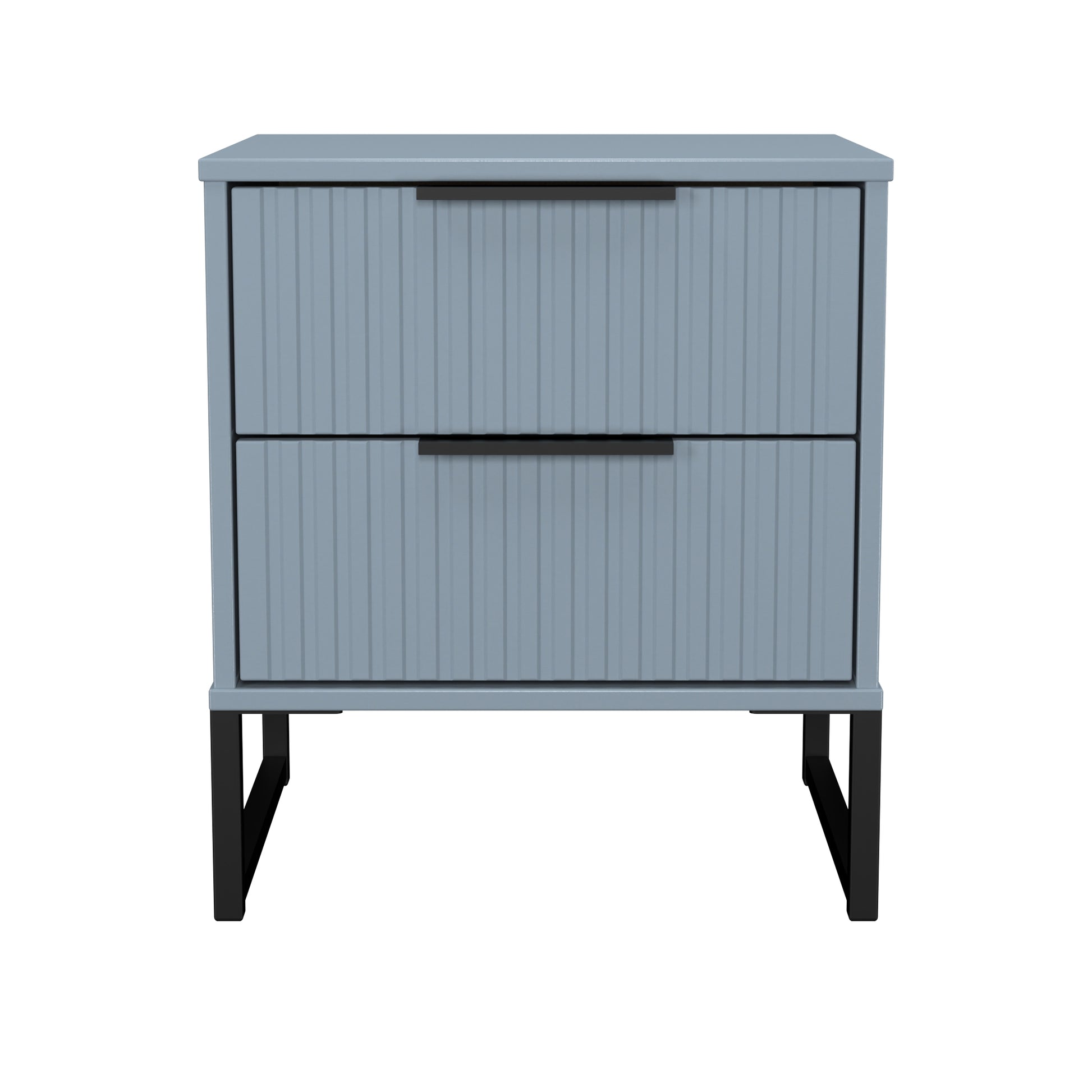 This compact 2 drawer bedside cabinet is practical and stylish. Perfect for any bedside or as a free standing storage unit. A new stand out range, with its new deep cut "fluted" grove patten of the drawer and door fronts. Featuring black metal handles and black sleigh legs. A striking and individual range that is perfect for the modern home. All our furniture is made to order in the United Kingdom, to the highest quality using responsibly sourced materials. It is delivered within 10 working days direct to your location of choice by one of our two man delivery teams, and comes fully assembled (although items with legs will have those legs removed during transit to avoid damage). Part of the Fluted Collection.
