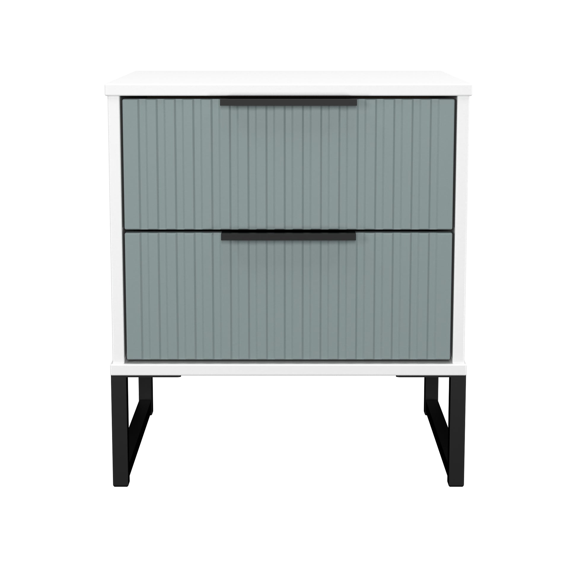 This compact 2 drawer bedside cabinet is practical and stylish. Perfect for any bedside or as a free standing storage unit. A new stand out range, with its new deep cut "fluted" grove patten of the drawer and door fronts. Featuring black metal handles and black sleigh legs. A striking and individual range that is perfect for the modern home. All our furniture is made to order in the United Kingdom, to the highest quality using responsibly sourced materials. It is delivered within 10 working days direct to your location of choice by one of our two man delivery teams, and comes fully assembled (although items with legs will have those legs removed during transit to avoid damage). Part of the Fluted Collection.