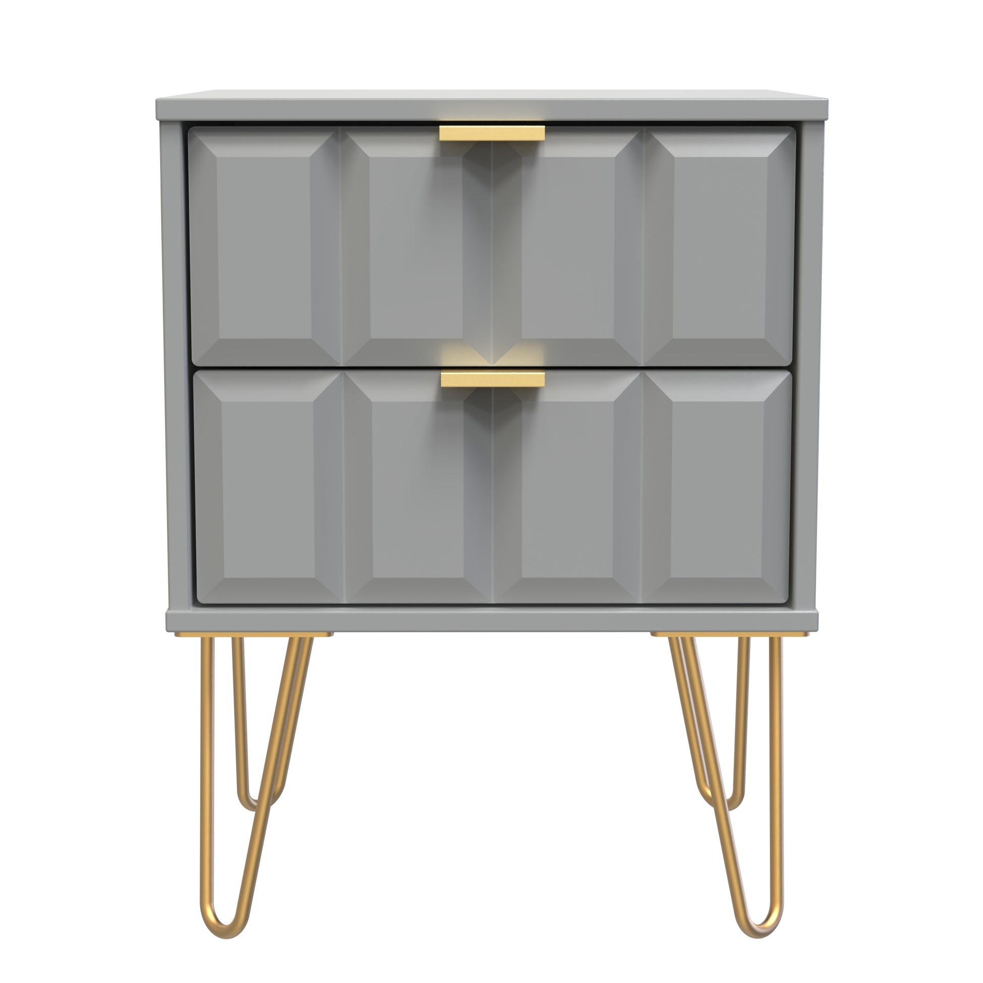 This 2 drawer bedside cabinet is practical and stylish. Perfect for any bedside or as a free standing storage unit. A modern and distinctive range. This ranges unique aesthetic is best represented by the distinctive "Cube" patten of the drawer and door fronts. Also features Gold Metal Handles and Gold Hairpin Legs. Comes in a wide range of colours including eye cathching two tone colour combinations. All our furniture is made to order in the United Kingdom, to the highest quality. It is delivered within 10 working days direct to your location of choice by one of our two man delivery teams, and comes fully assembled (although legs may be removed to prevent damage in transit). Part of the Cube Collection.