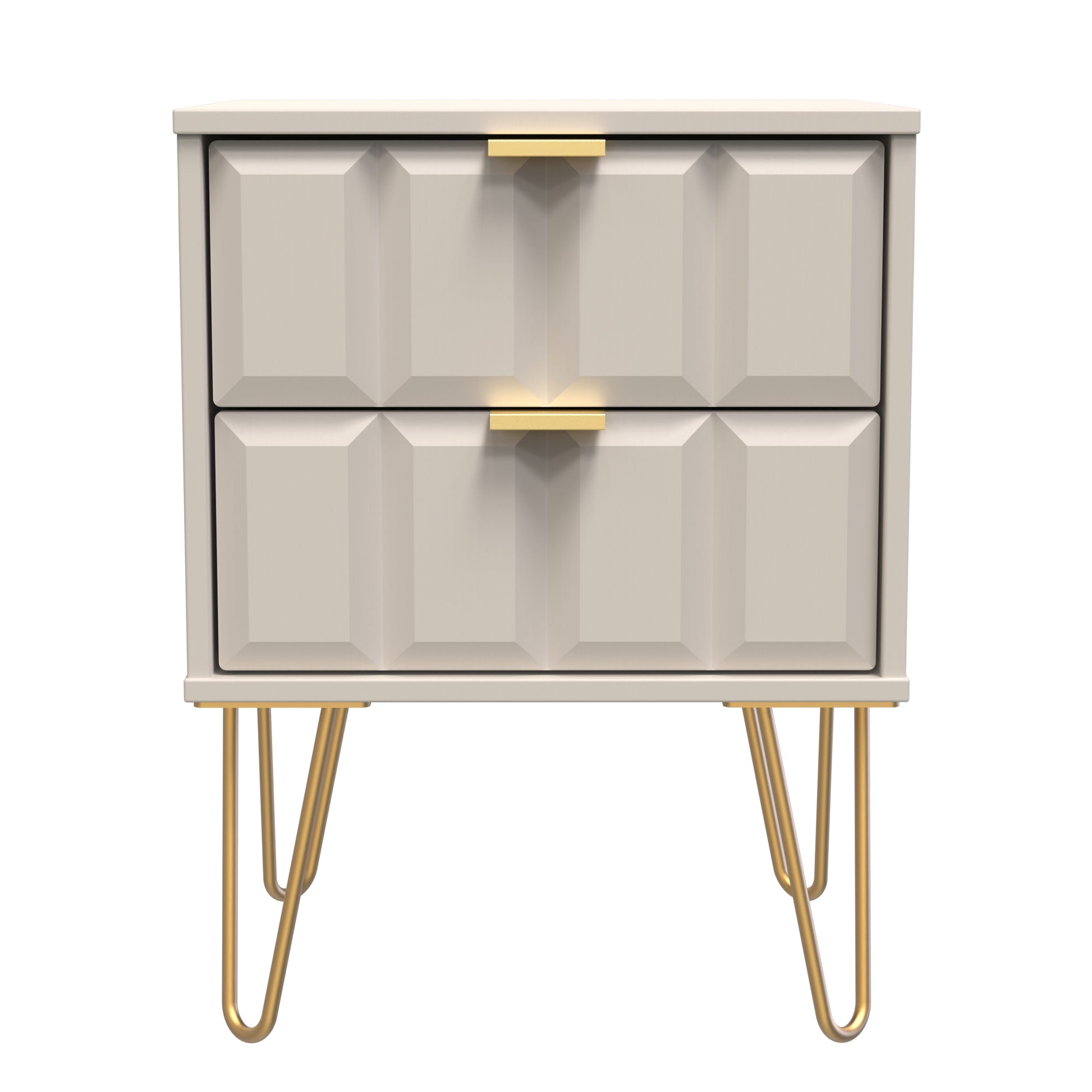 This 2 drawer bedside cabinet is practical and stylish. Perfect for any bedside or as a free standing storage unit. A modern and distinctive range. This ranges unique aesthetic is best represented by the distinctive "Cube" patten of the drawer and door fronts. Also features Gold Metal Handles and Gold Hairpin Legs. Comes in a wide range of colours including eye cathching two tone colour combinations. All our furniture is made to order in the United Kingdom, to the highest quality. It is delivered within 10 working days direct to your location of choice by one of our two man delivery teams, and comes fully assembled (although legs may be removed to prevent damage in transit). Part of the Cube Collection.