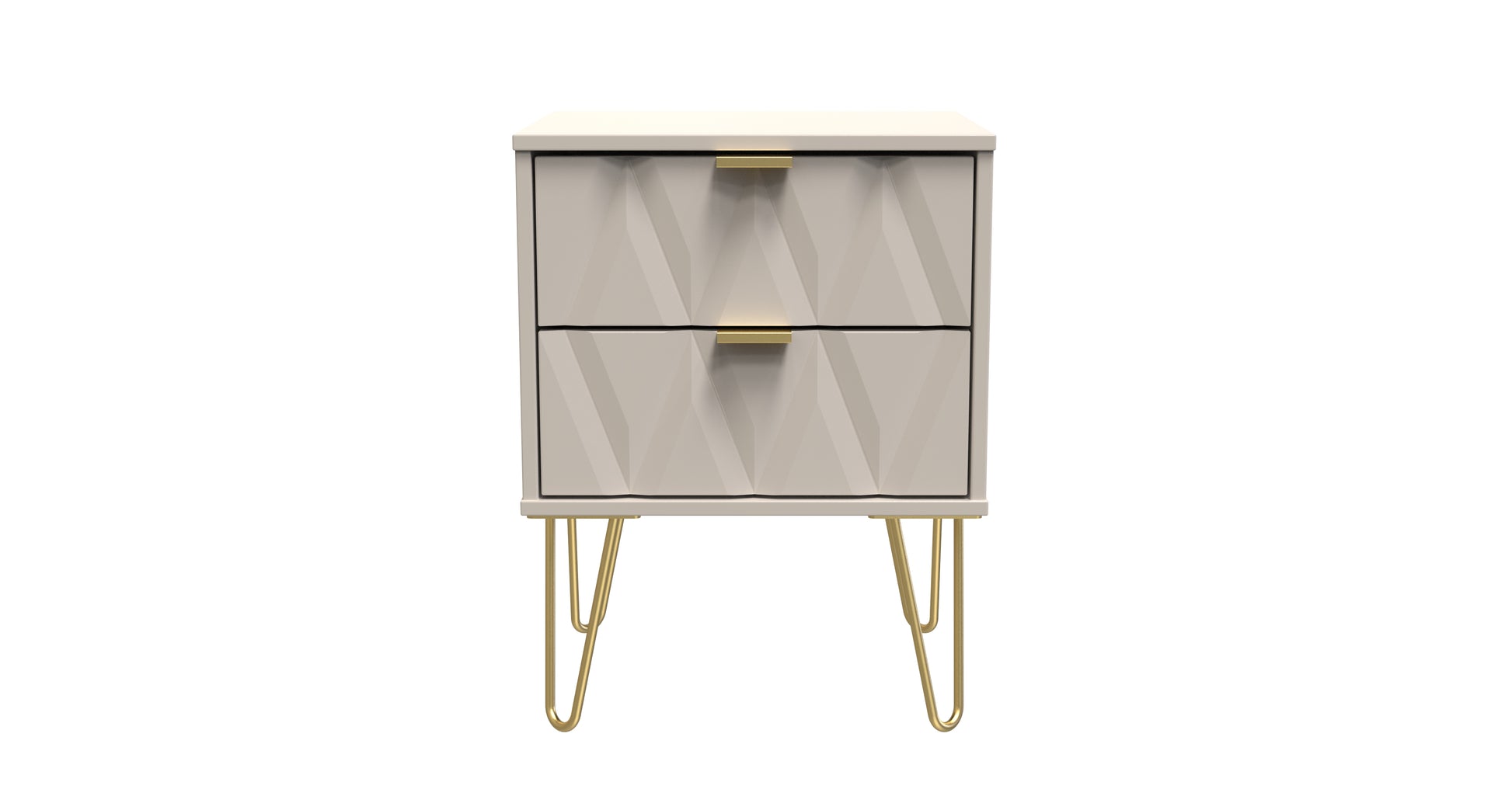 This 2 drawer bedside cabinet is practical and stylish. Perfect for any bedside or as a free standing storage unit. Say hello to contemporary cool with this modern range, with distinctive patterned drawers and a variety of colour options available to compliment any interior design. Gold metal handles and sturdy hairpin legs complete the storage solution. All our furniture is made to order in the United Kingdom, to the highest quality. It is delivered within 10 working days direct to your location of choice by one of our two man delivery teams, and comes fully assembled (although legs may be removed to prevent damage in transit). Part of the Diamond Collection.