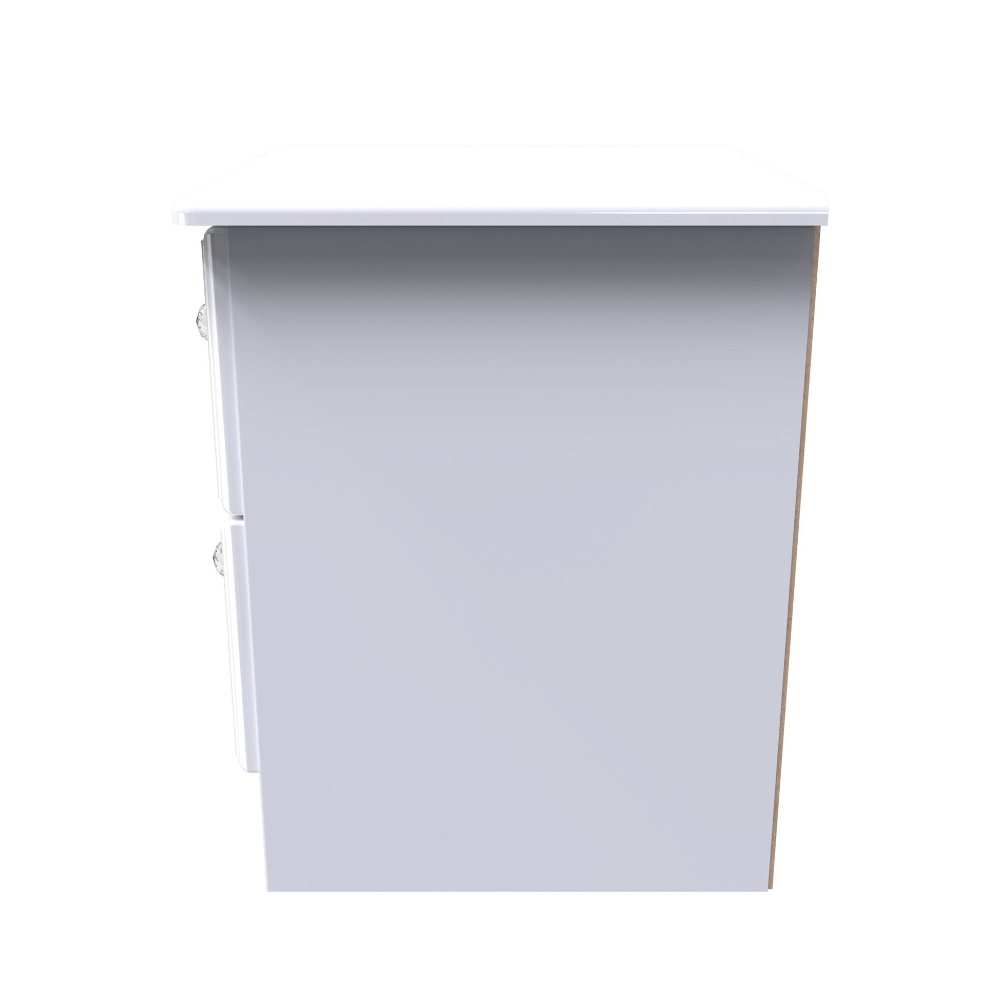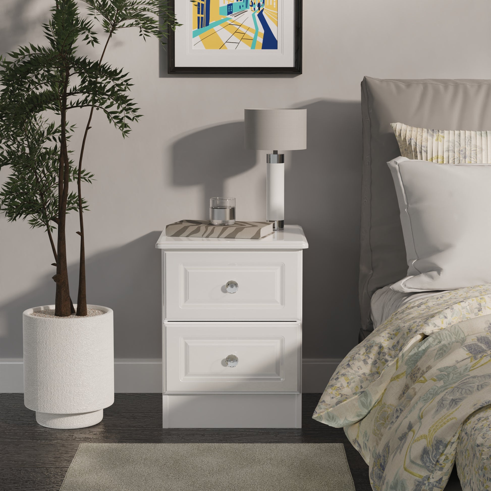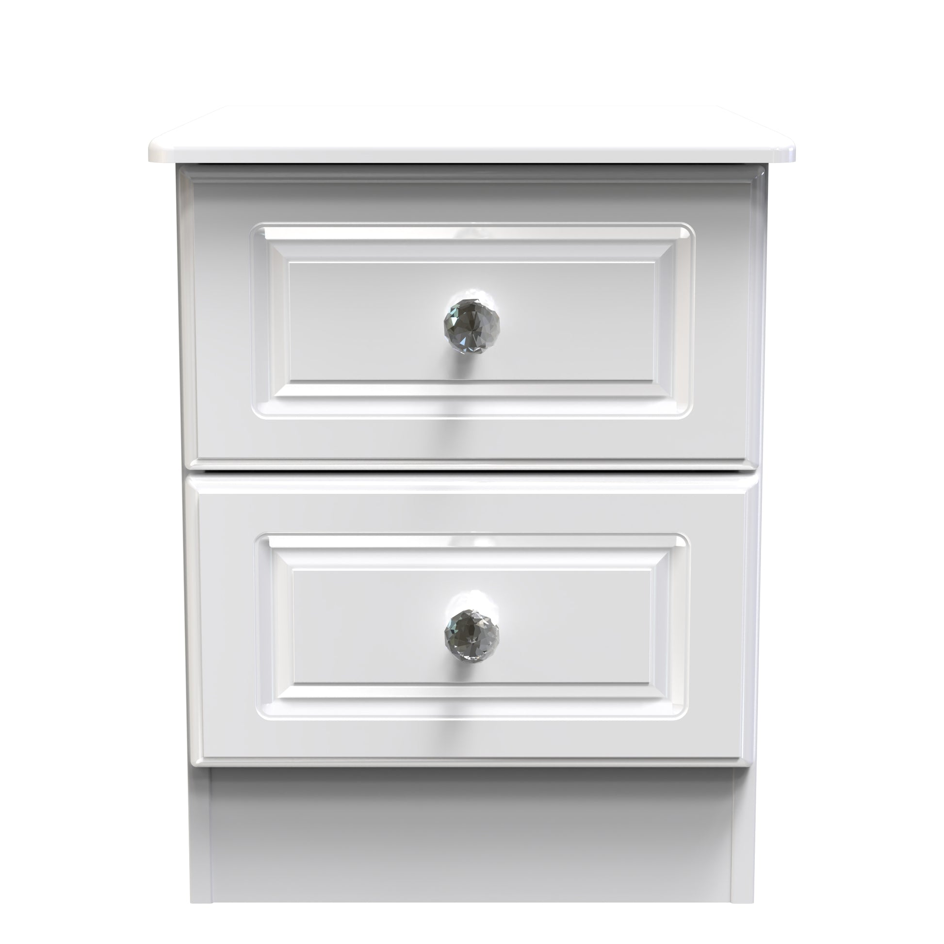 This 2 drawer bedside cabinet is practical and stylish. Perfect for any bedside or as a free standing storage unit. This is a stylish extensive range of bedroom furniture. It is beautifully finished with a high gloss veneer, featuring crystal handles to suit a glamorous lifestyle. Easy to maintain with scratch resistance surfaces. All our furniture is made to order in the United Kingdom, to the highest quality. It is delivered within 10 working days direct to your location of choice by one of our two man delivery teams, and comes fully assembled (although legs may be removed to prevent damage in transit). Part of the Balmoral Collection.