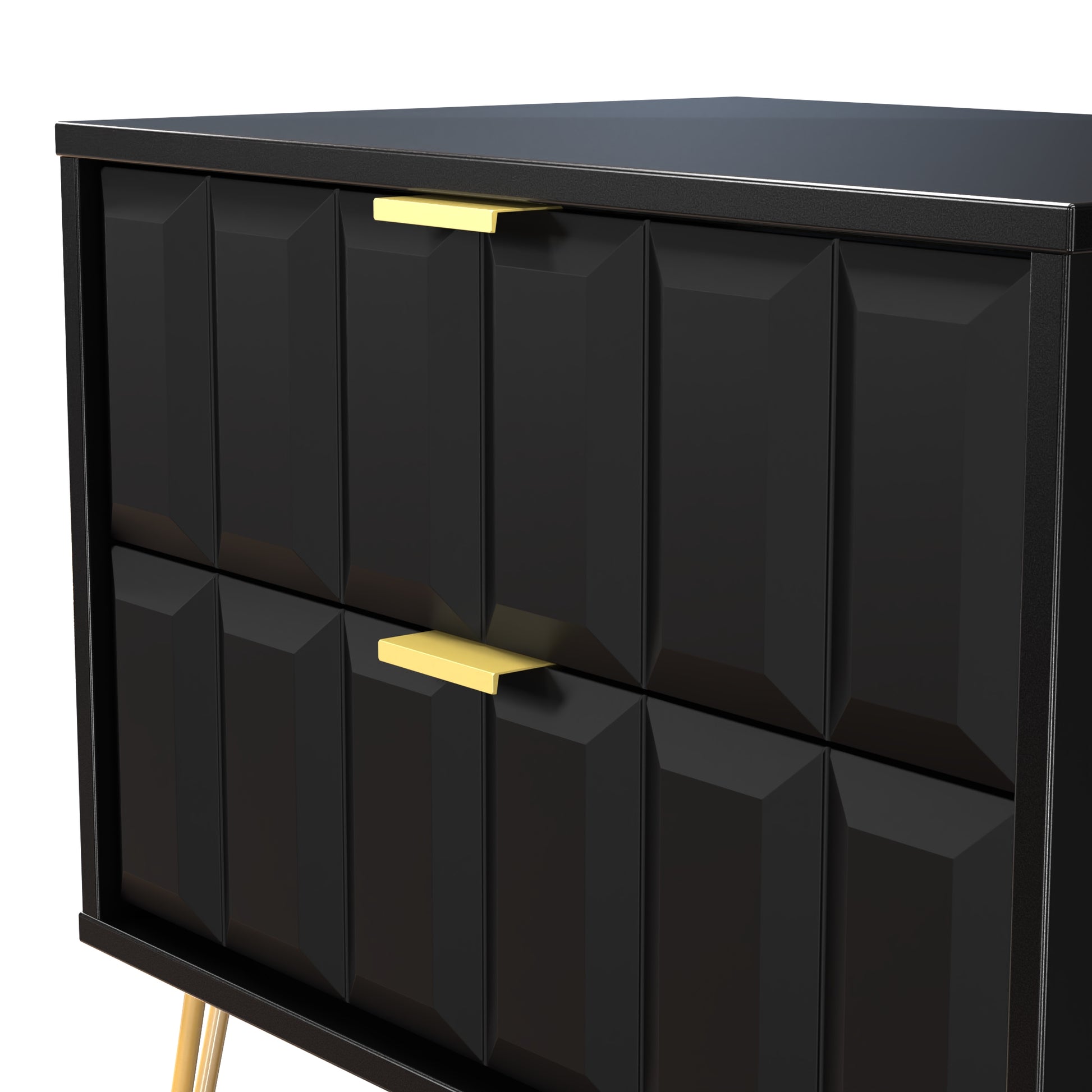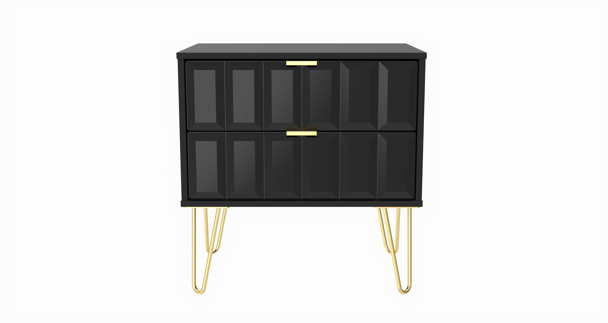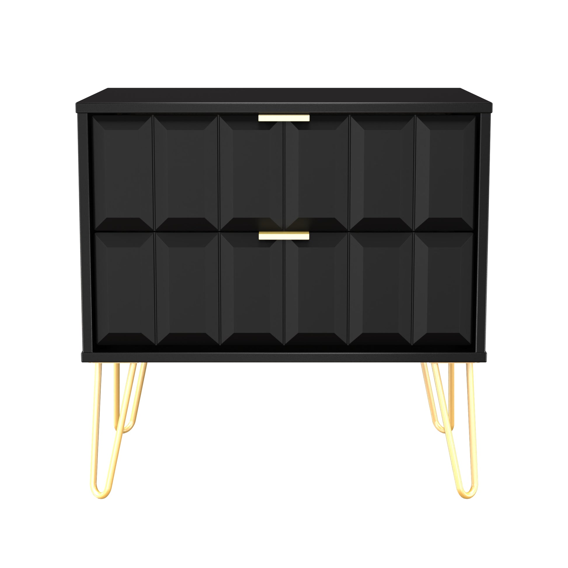 This 2 drawer bedside cabinet is wider than normal for added practicality. Perfect for any bedside or as a free standing storage unit. A modern and distinctive range. This ranges unique aesthetic is best represented by the distinctive "Cube" patten of the drawer and door fronts. Also features Gold Metal Handles and Gold Hairpin Legs. Comes in a wide range of colours including eye cathching two tone colour combinations. All our furniture is made to order in the United Kingdom, to the highest quality. It is delivered within 10 working days direct to your location of choice by one of our two man delivery teams, and comes fully assembled (although legs may be removed to prevent damage in transit). Part of the Cube Collection.