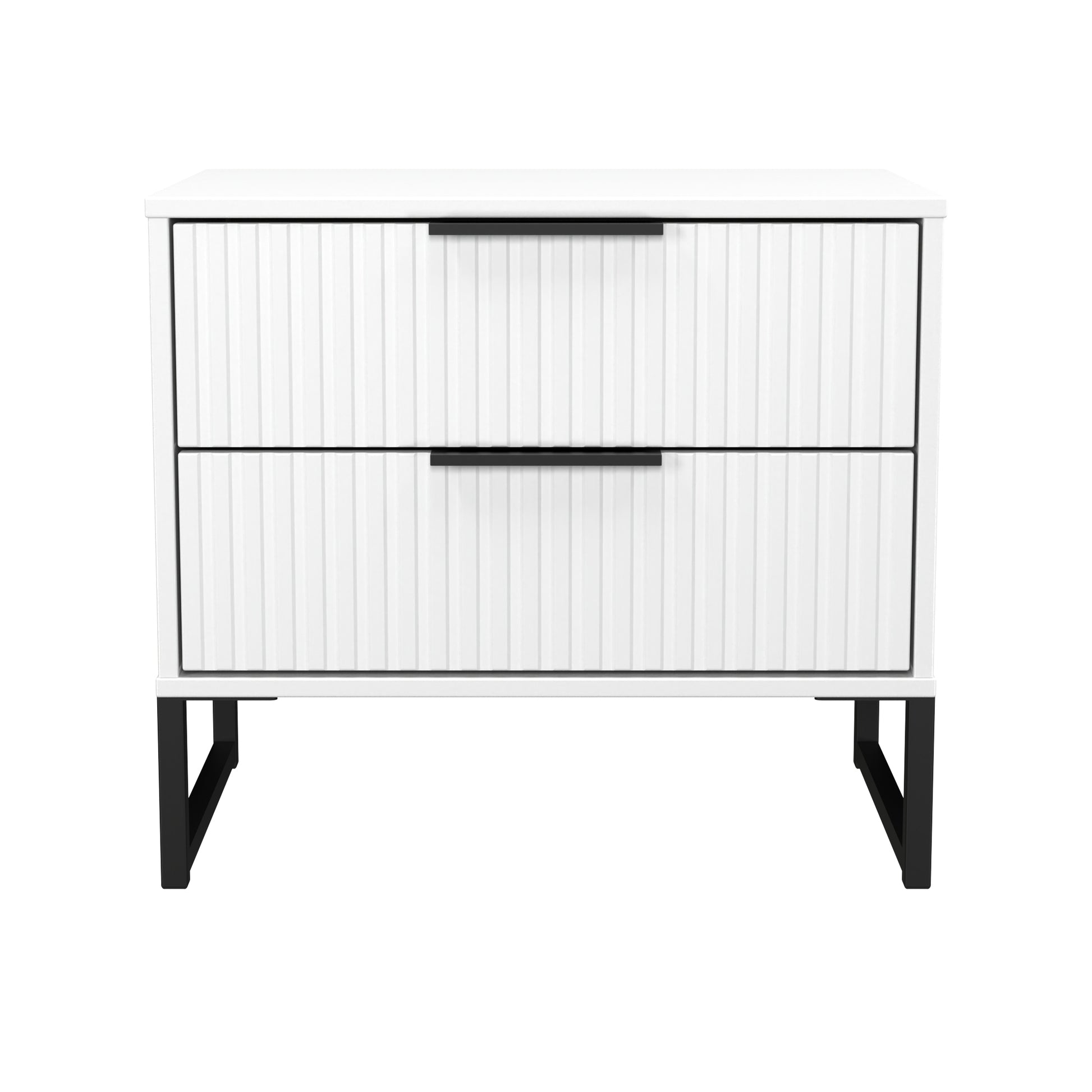 This 2 drawer bedside cabinet is wider than normal for added practicality. Perfect for any bedside or as a free standing storage unit. A new stand out range, with its new deep cut "fluted" grove patten of the drawer and door fronts. Featuring black metal handles and black sleigh legs. A striking and individual range that is perfect for the modern home. All our furniture is made to order in the United Kingdom, to the highest quality using responsibly sourced materials. It is delivered within 10 working days direct to your location of choice by one of our two man delivery teams, and comes fully assembled (although items with legs will have those legs removed during transit to avoid damage). Part of the Fluted Collection.