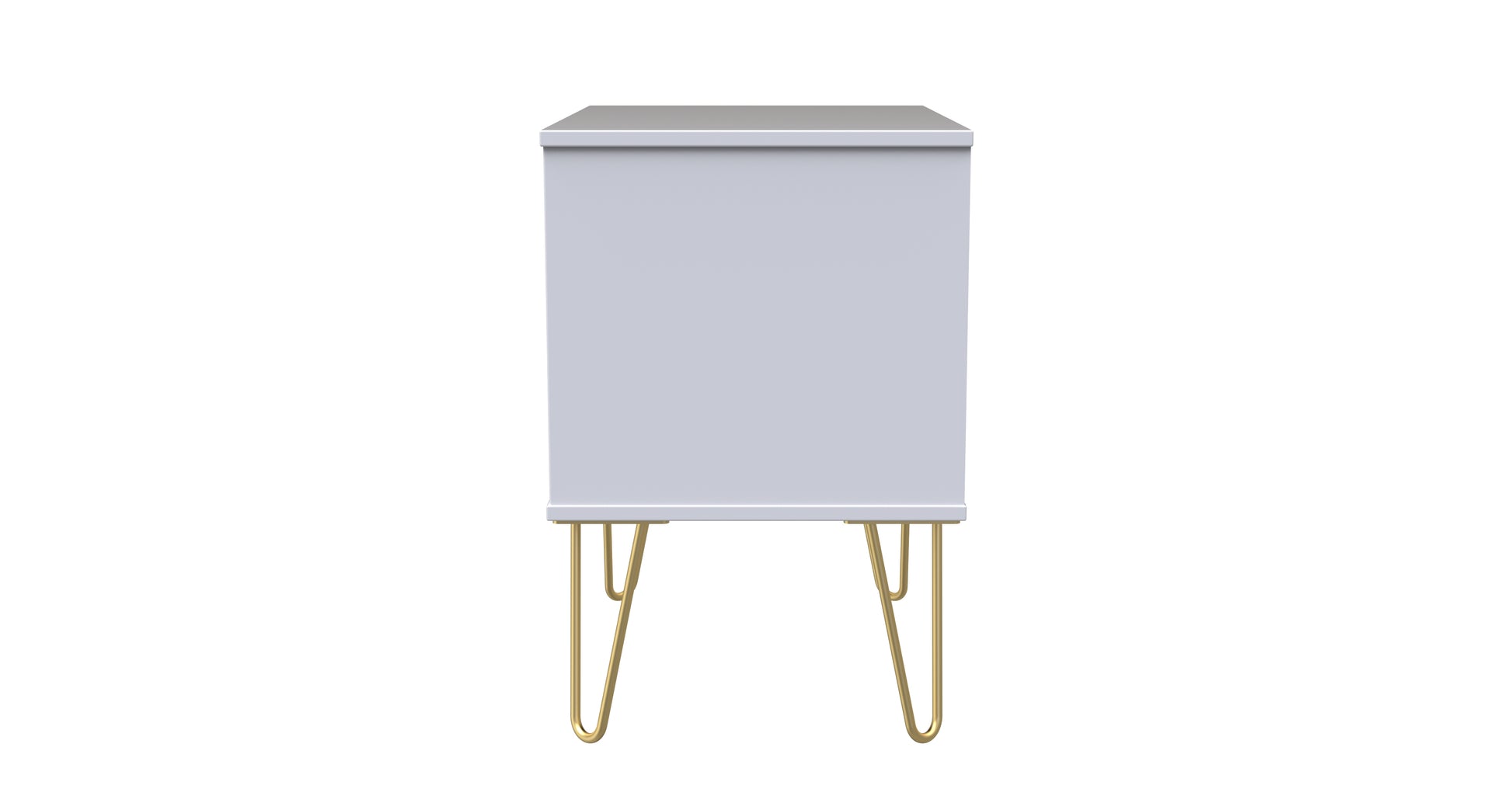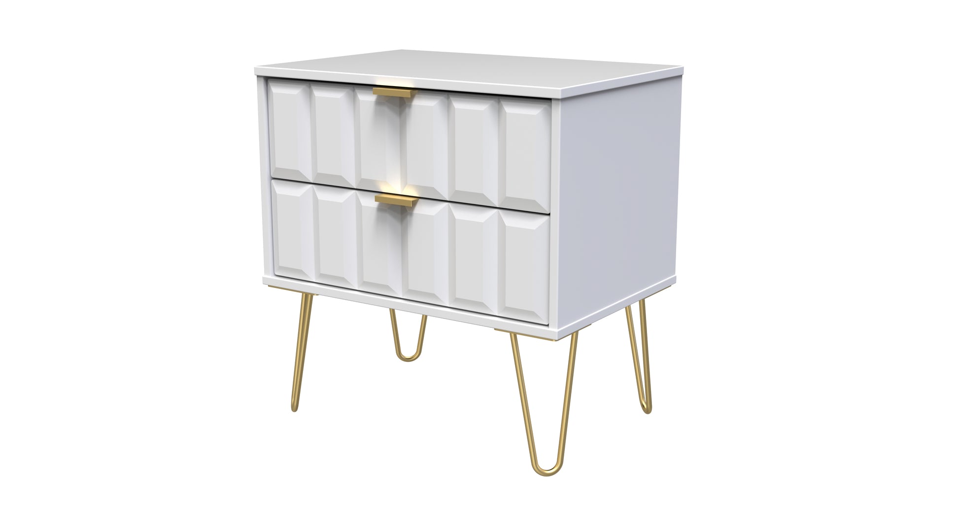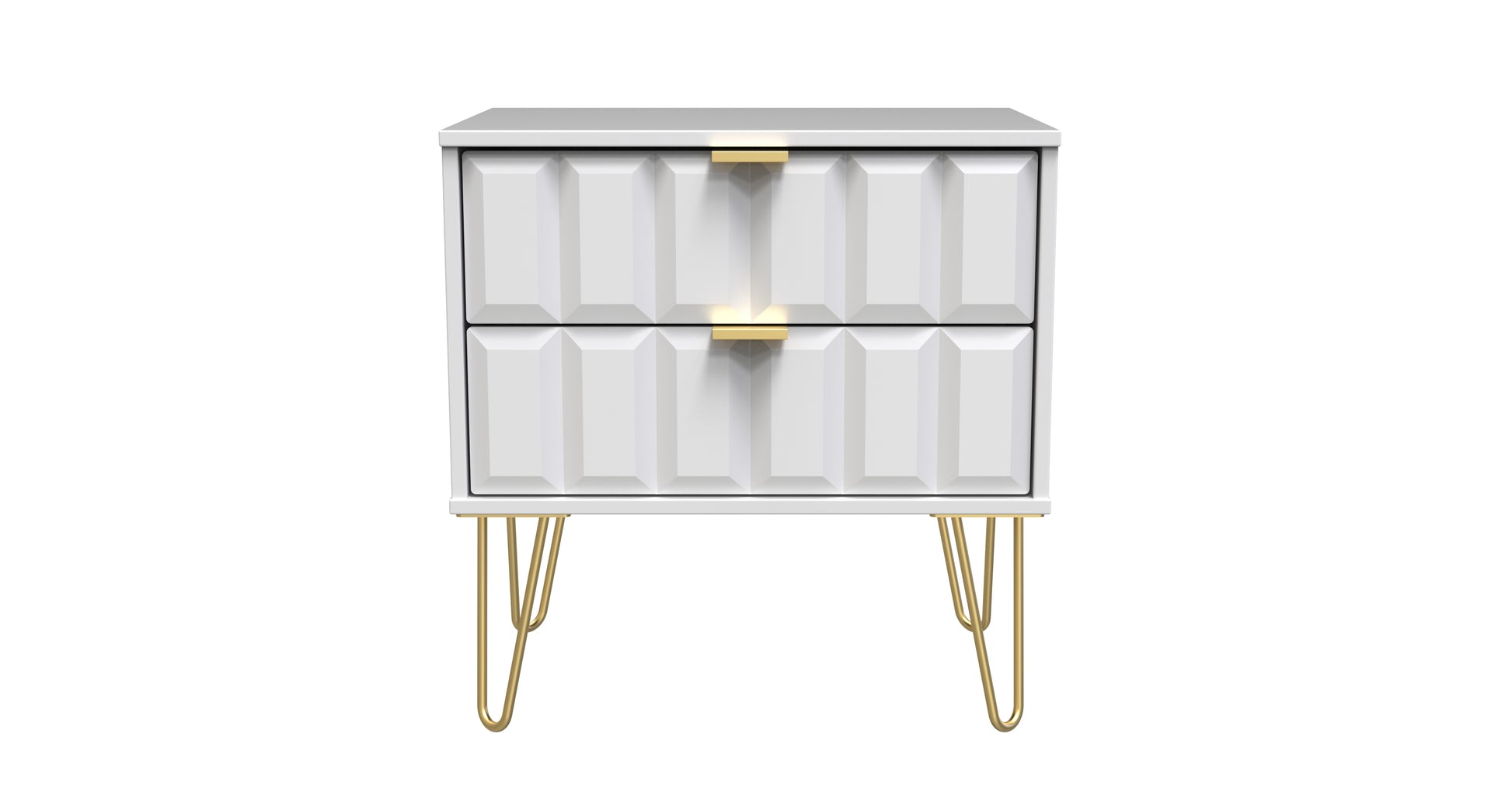 This 2 drawer bedside cabinet is wider than normal for added practicality. Perfect for any bedside or as a free standing storage unit. A modern and distinctive range. This ranges unique aesthetic is best represented by the distinctive "Cube" patten of the drawer and door fronts. Also features Gold Metal Handles and Gold Hairpin Legs. Comes in a wide range of colours including eye cathching two tone colour combinations. All our furniture is made to order in the United Kingdom, to the highest quality. It is delivered within 10 working days direct to your location of choice by one of our two man delivery teams, and comes fully assembled (although legs may be removed to prevent damage in transit). Part of the Cube Collection.