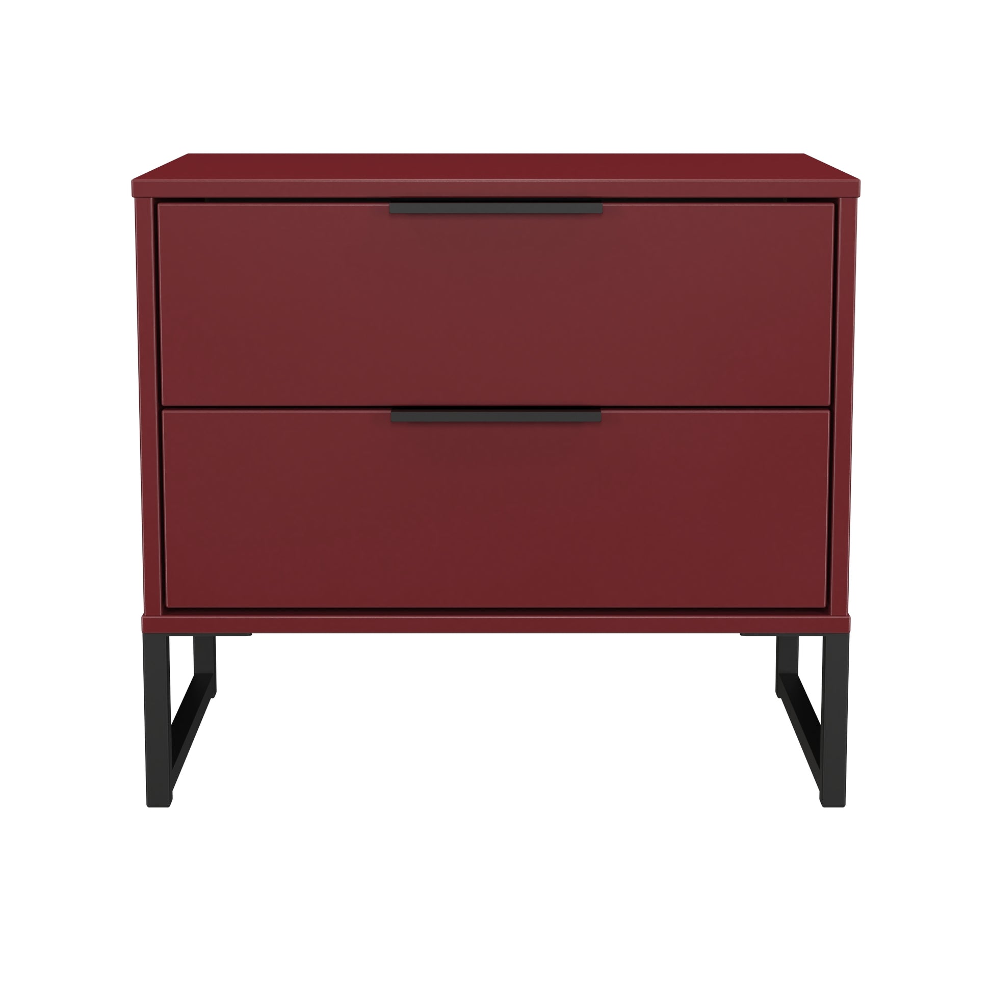 This 2 drawer bedside cabinet is wider than normal for added practicality. Perfect for any bedside or as a free standing storage unit. Modern and stylish, this striking range is available in a range of durable scratch resistant colour or natural wood finishes. With pull handles on all doors and drawers, with black sleigh metal legs. Comes with Soft Close Drawers. All our furniture is made to order in the United Kingdom, to the highest quality. It is delivered within 10 working days direct to your location of choice by one of our two man delivery teams, and comes fully assembled (although legs may be removed to prevent damage in transit). Part of the Hong Kong G Collection.