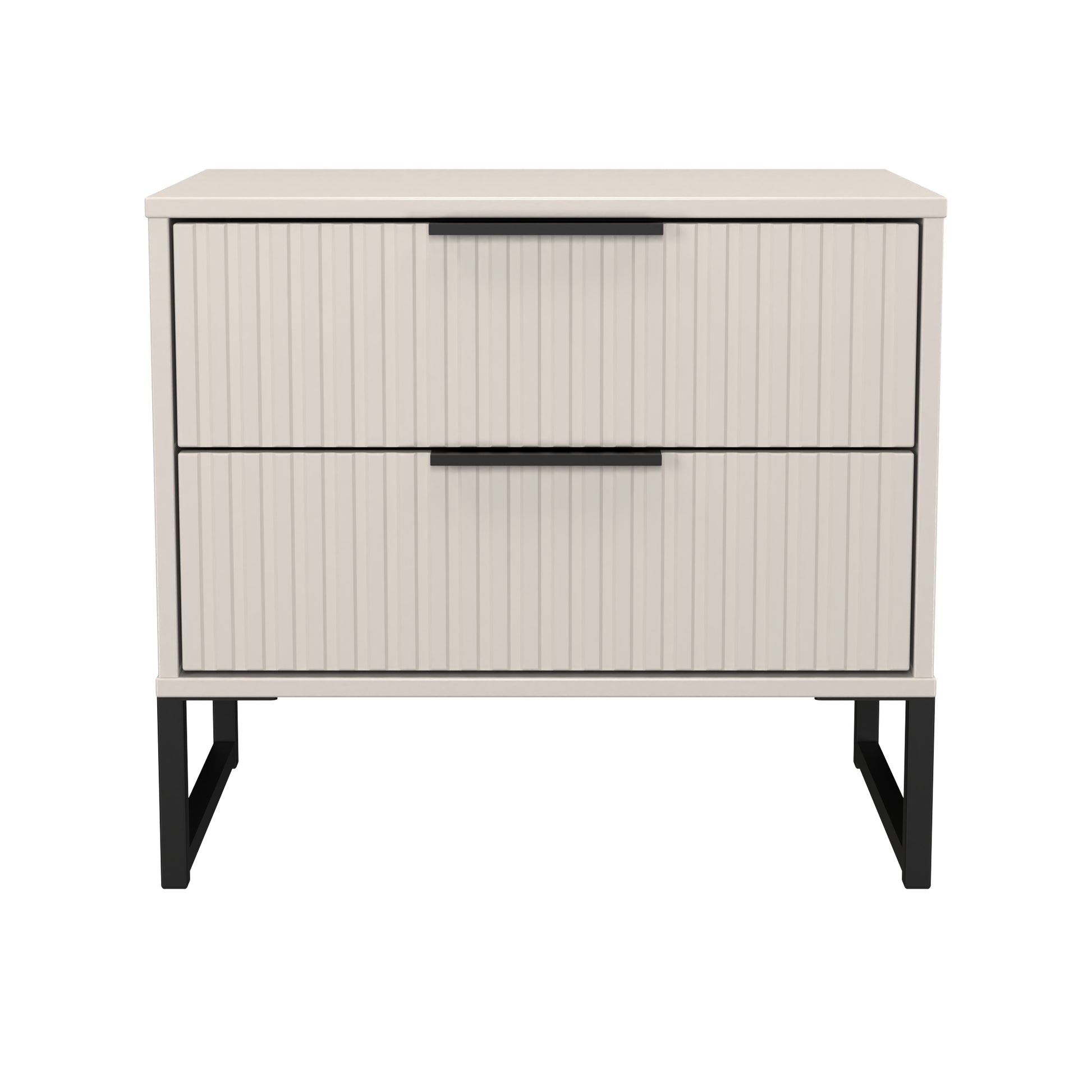 This 2 drawer bedside cabinet is wider than normal for added practicality. Perfect for any bedside or as a free standing storage unit. A new stand out range, with its new deep cut "fluted" grove patten of the drawer and door fronts. Featuring black metal handles and black sleigh legs. A striking and individual range that is perfect for the modern home. All our furniture is made to order in the United Kingdom, to the highest quality using responsibly sourced materials. It is delivered within 10 working days direct to your location of choice by one of our two man delivery teams, and comes fully assembled (although items with legs will have those legs removed during transit to avoid damage). Part of the Fluted Collection.