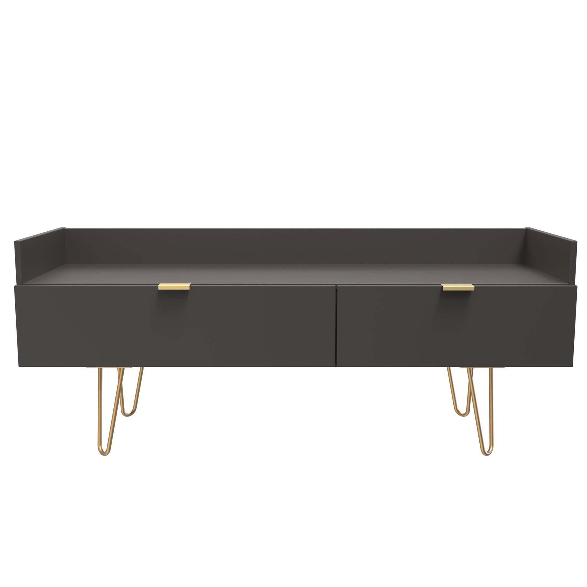 This media Console unit features 2 storage drawers on smooth metal runners. Modern and stylish, this striking range is available in a range of durable scratch resistant colour or natural wood finishes. With pull handles on all doors and drawers, with gold hairpin metal legs. Comes with Soft Close Drawers. All our furniture is made to order in the United Kingdom, to the highest quality. It is delivered within 10 working days direct to your location of choice by one of our two man delivery teams, and comes fully assembled (although legs may be removed to prevent damage in transit). Part of the Hong Kong F Collection.