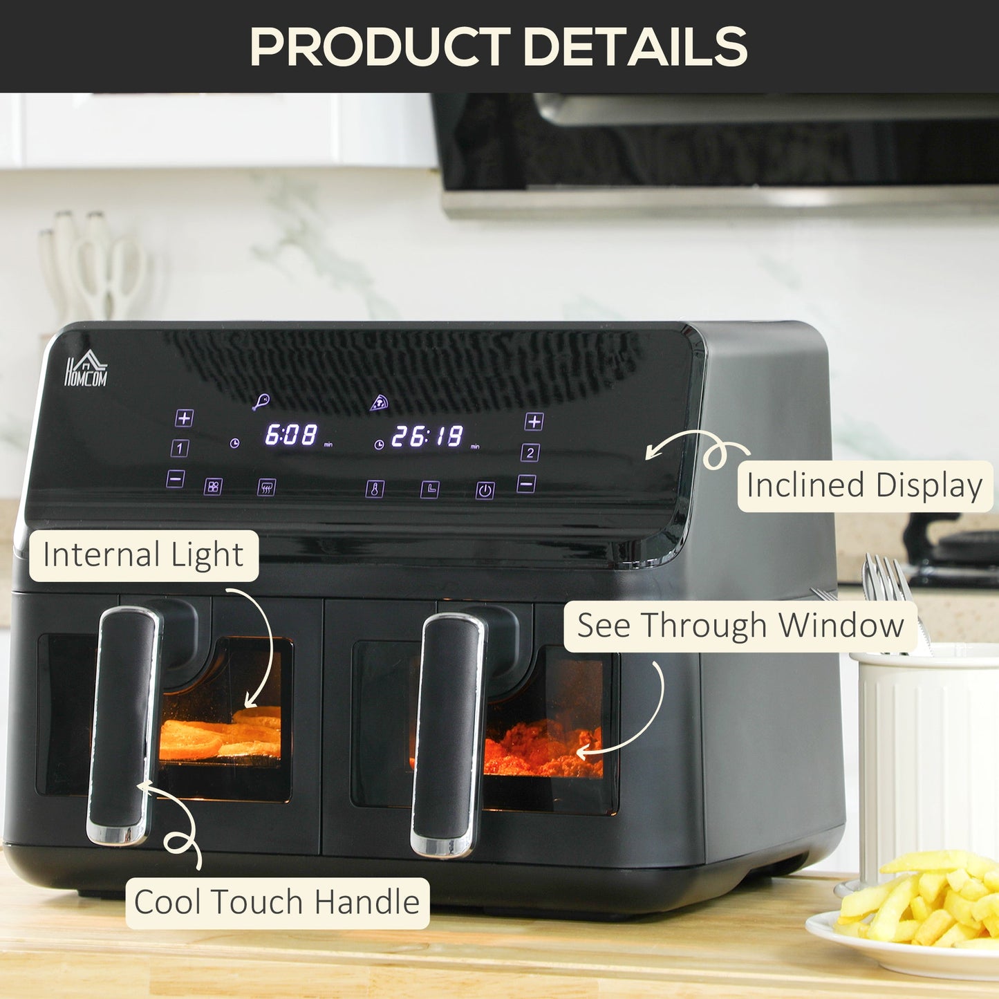 Double the delishness with this HOMCOM twin air fryer. With two separate cooking baskets, which can be individually controlled, you can cook two separate dishes at once - ideal for when you want to cook a full meal; saves time. The 80-200? adjustable temperature means you can cook food at a suitable heat, with a 60-minute timer to cook to the time you want without having to overlook it constantly. Comes with a cool-touch handle and overheat protection for safety.