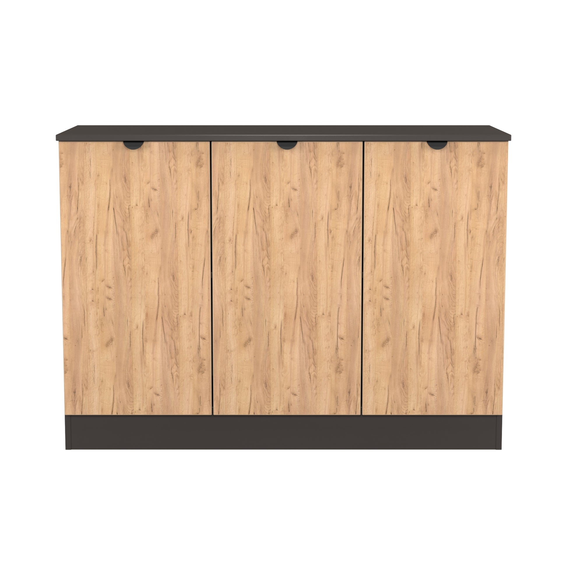 This 3 door wide storage cupboard has internal shelves and is perfect for any living room, dinning room or louge. Could also be used as a TV/Media stand or side board.This modern practical range really stands out. With Semi-Circular Black metal Pull handles and many pieces featuring open shelf storage, making this affordable range both stylish and practical.All our furniture is made to order in the United Kingdom, to the highest quality using responsibly sourced materials. It is delivered within 10 working days direct to your location of choice by one of our two man delivery teams, and comes fully assembled (although items with legs will have those legs removed during transit to avoid damage). Part of the Bora Collection.