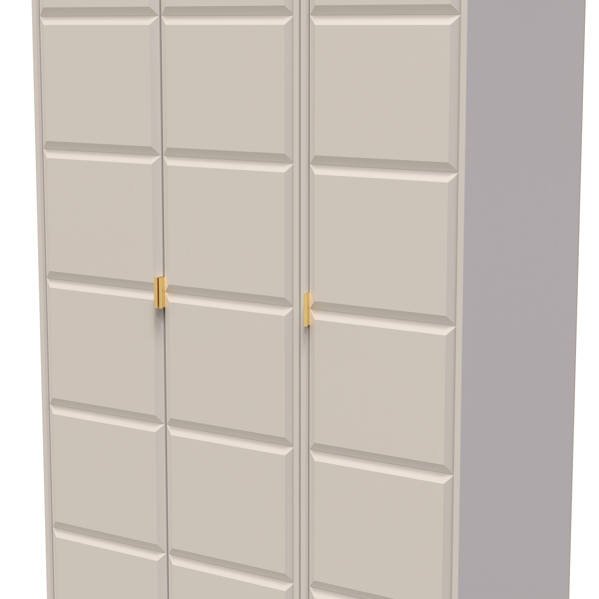 This tall triple 3 door wardrobe is perfect for any bedroom when a normal wardrobe is just not large enough. A modern and distinctive range. This ranges unique aesthetic is best represented by the distinctive "Cube" patten of the drawer and door fronts. Also features Gold Metal Handles and Gold Hairpin Legs. Comes in a wide range of colours including eye cathching two tone colour combinations. All our furniture is made to order in the United Kingdom, to the highest quality. It is delivered within 10 working days direct to your location of choice by one of our two man delivery teams, and comes fully assembled (although legs may be removed to prevent damage in transit). Part of the Cube Collection.