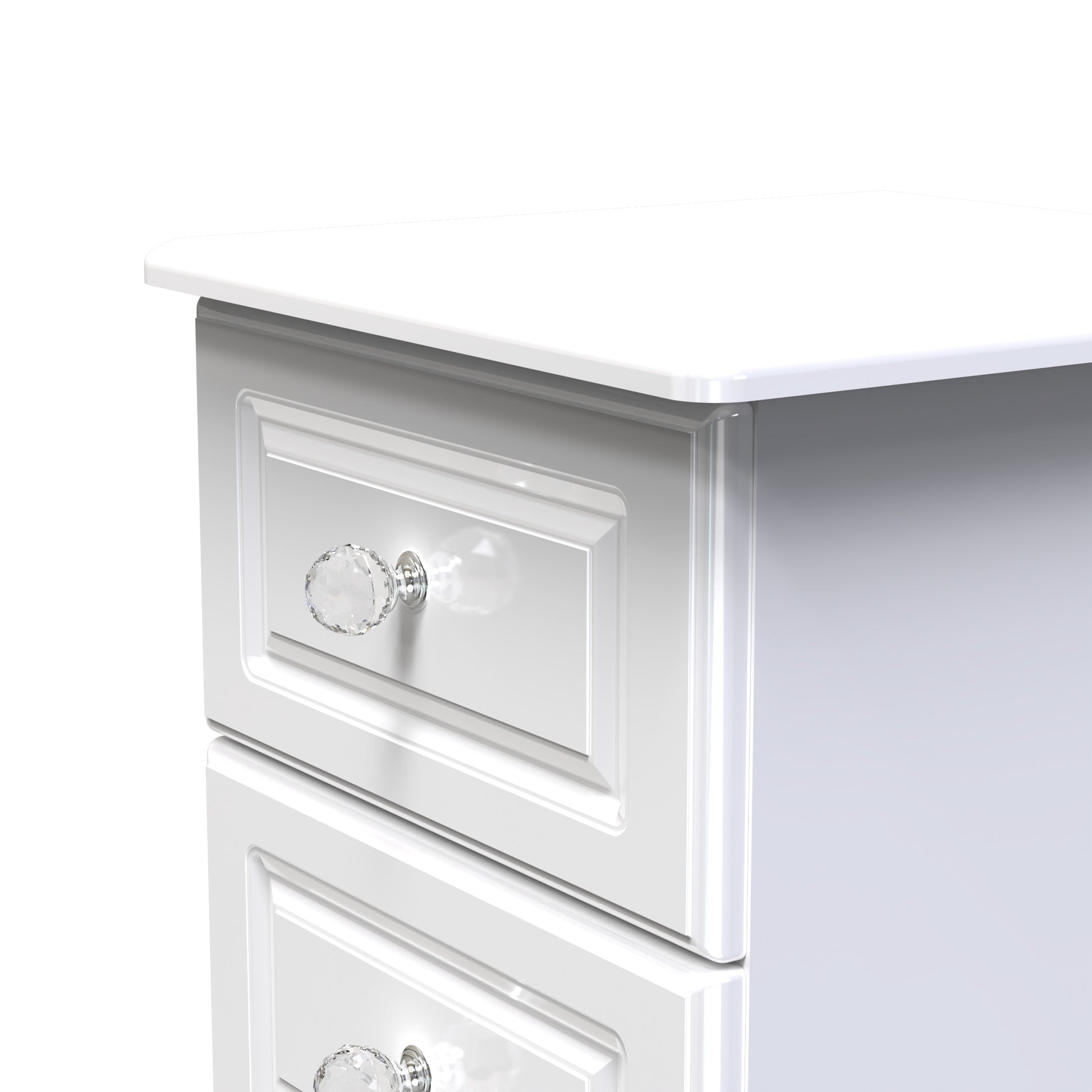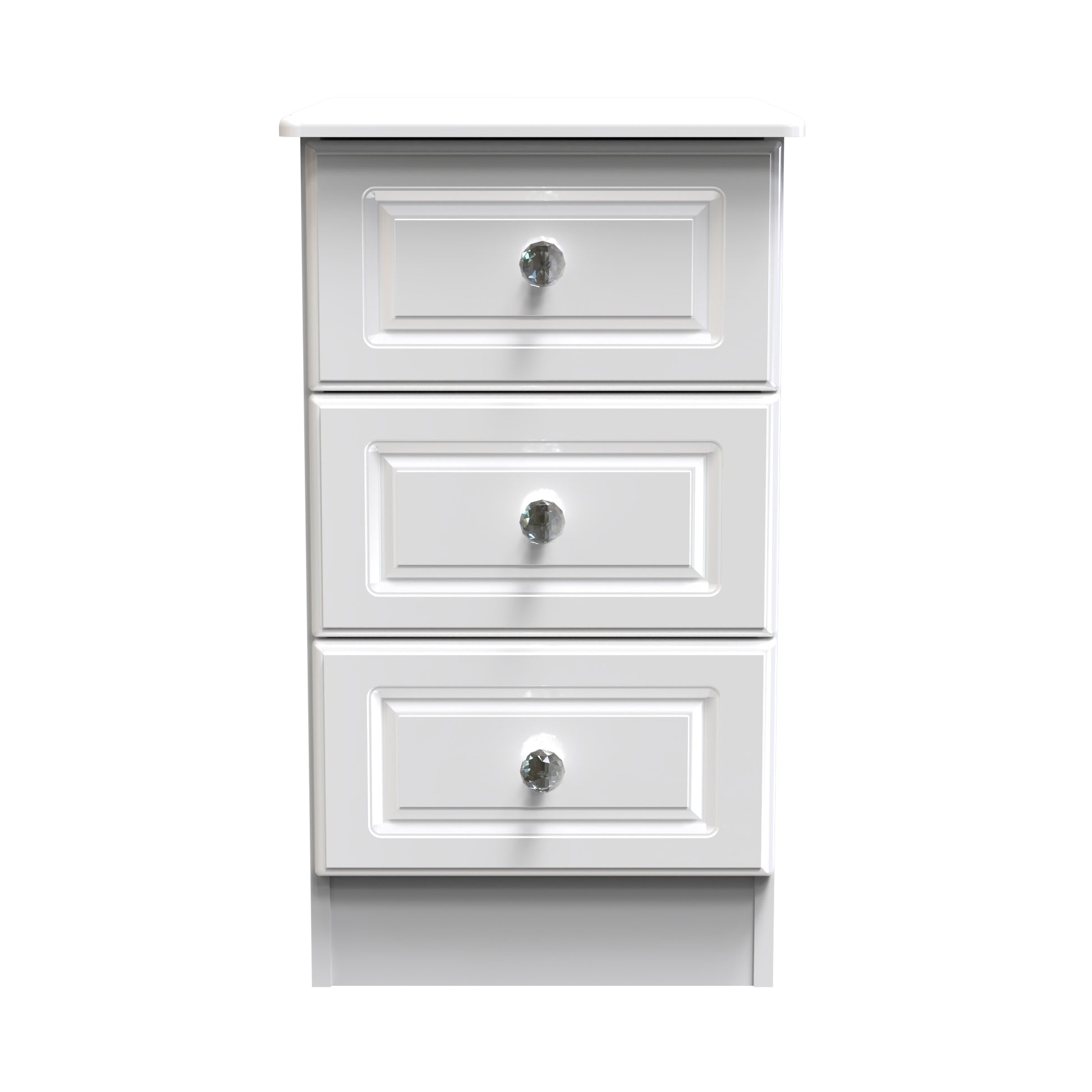 This 3 drawer bedside cabinet is practical and stylish. Perfect for any bedside or as a free standing storage unit. This is a stylish extensive range of bedroom furniture. It is beautifully finished with a high gloss veneer, featuring crystal handles to suit a glamorous lifestyle. Easy to maintain with scratch resistance surfaces. All our furniture is made to order in the United Kingdom, to the highest quality. It is delivered within 10 working days direct to your location of choice by one of our two man delivery teams, and comes fully assembled (although legs may be removed to prevent damage in transit). Part of the Balmoral Collection.