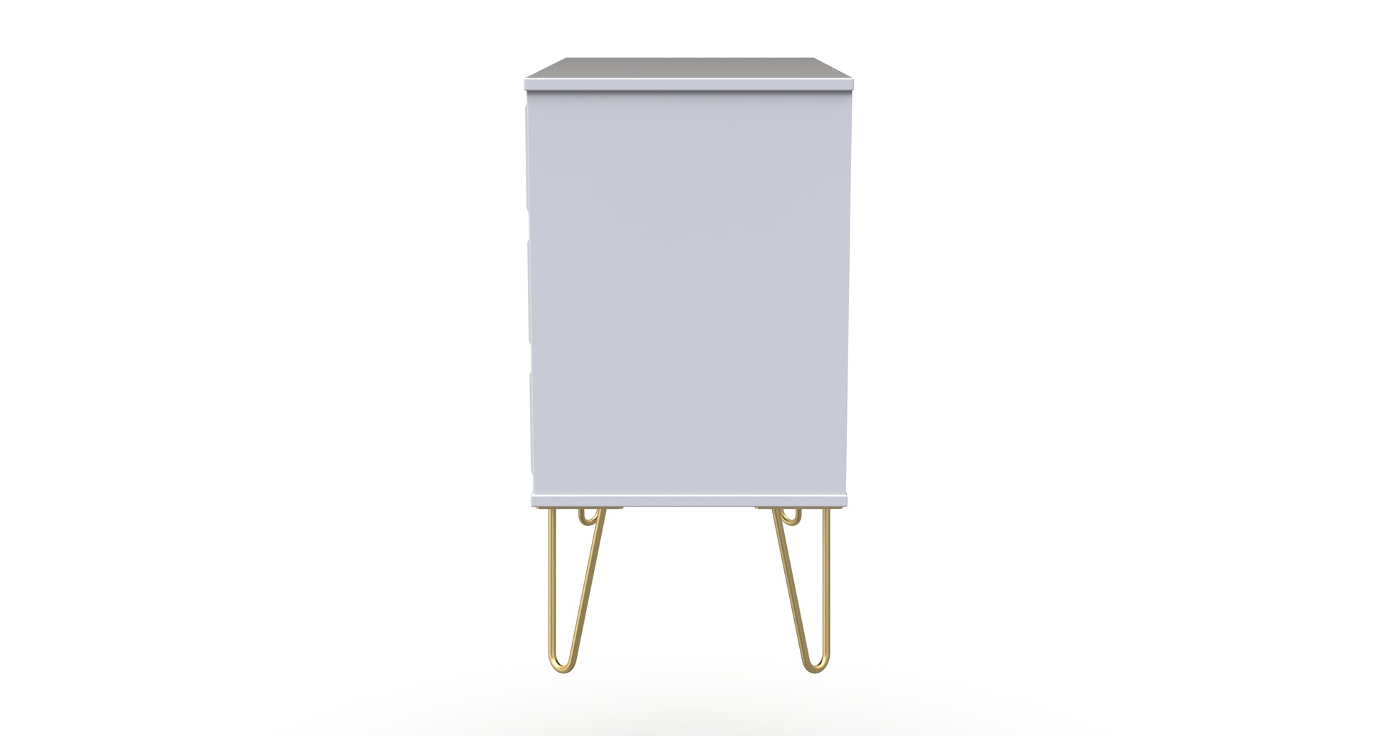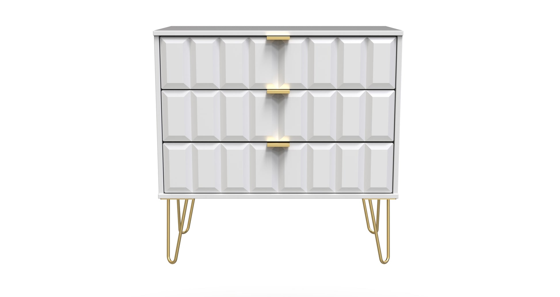 This wide 3 drawer chest of drawers is practical and stylish. Perfect for any home as a free standing storage unit. A modern and distinctive range. This ranges unique aesthetic is best represented by the distinctive "Cube" patten of the drawer and door fronts. Also features Gold Metal Handles and Gold Hairpin Legs. Comes in a wide range of colours including eye cathching two tone colour combinations. All our furniture is made to order in the United Kingdom, to the highest quality. It is delivered within 10 working days direct to your location of choice by one of our two man delivery teams, and comes fully assembled (although legs may be removed to prevent damage in transit). Part of the Cube Collection.
