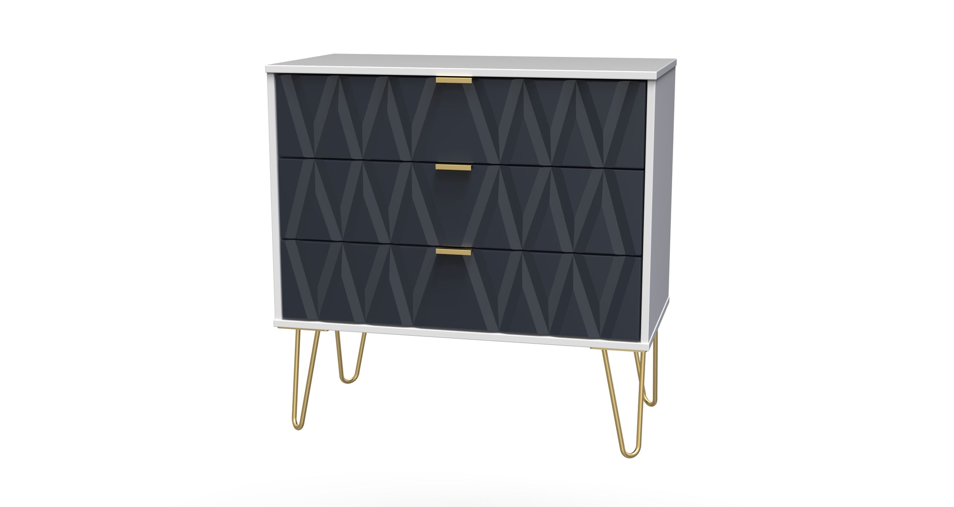 This wide 3 drawer chest of drawers is practical and stylish. Perfect for any home as a free standing storage unit. Say hello to contemporary cool with this modern range, with distinctive patterned drawers and a variety of colour options available to compliment any interior design. Gold metal handles and sturdy hairpin legs complete the storage solution. All our furniture is made to order in the United Kingdom, to the highest quality. It is delivered within 10 working days direct to your location of choice by one of our two man delivery teams, and comes fully assembled (although legs may be removed to prevent damage in transit). Part of the Diamond Collection.