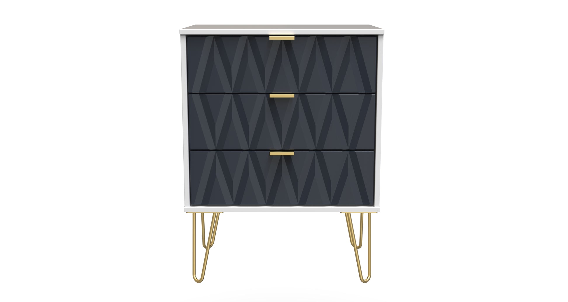 This 3 drawer bedside cabinet is wider than normal for added practicality. Perfect for any bedside or as a free standing storage unit. Say hello to contemporary cool with this modern range, with distinctive patterned drawers and a variety of colour options available to compliment any interior design. Gold metal handles and sturdy hairpin legs complete the storage solution. All our furniture is made to order in the United Kingdom, to the highest quality. It is delivered within 10 working days direct to your location of choice by one of our two man delivery teams, and comes fully assembled (although legs may be removed to prevent damage in transit). Part of the Diamond Collection.