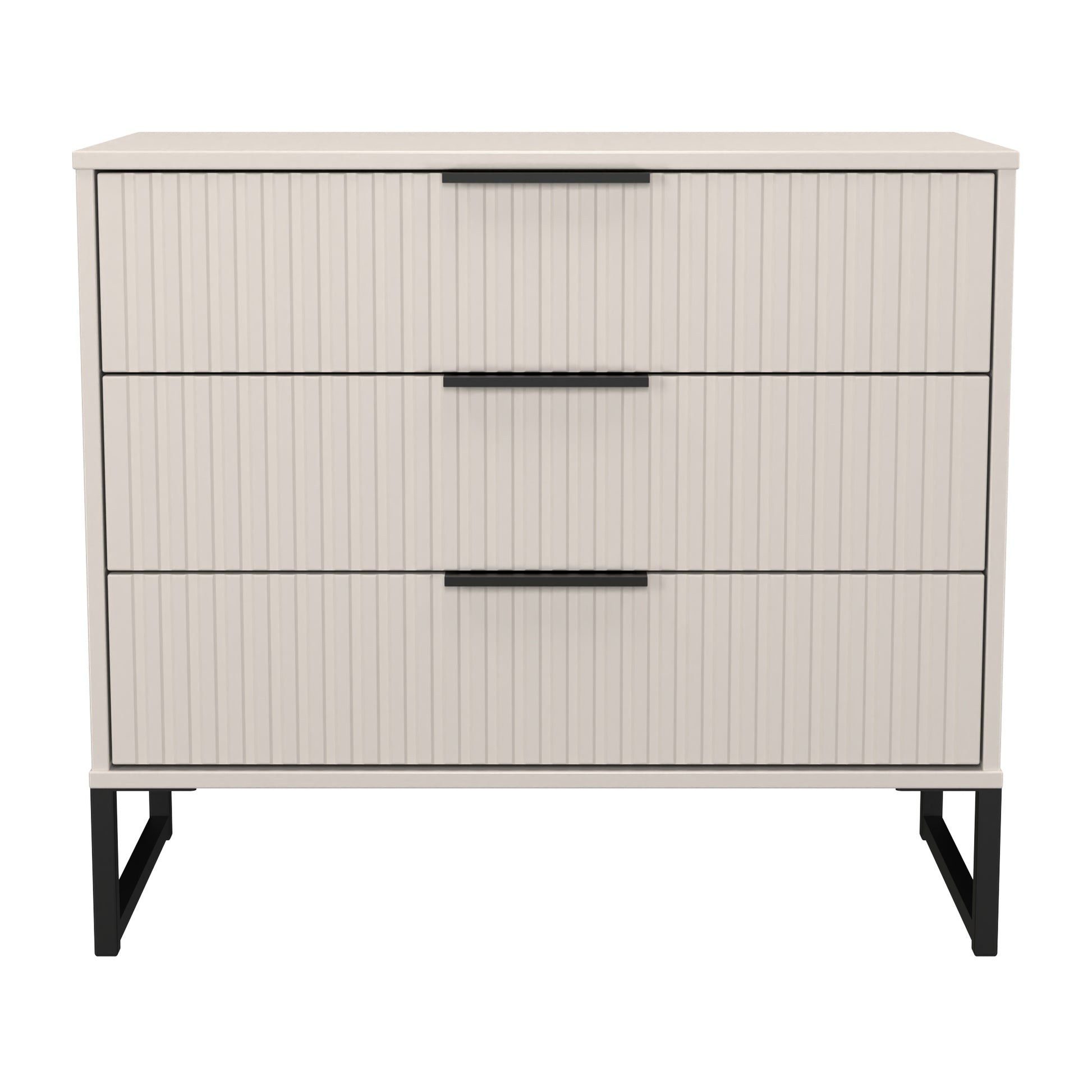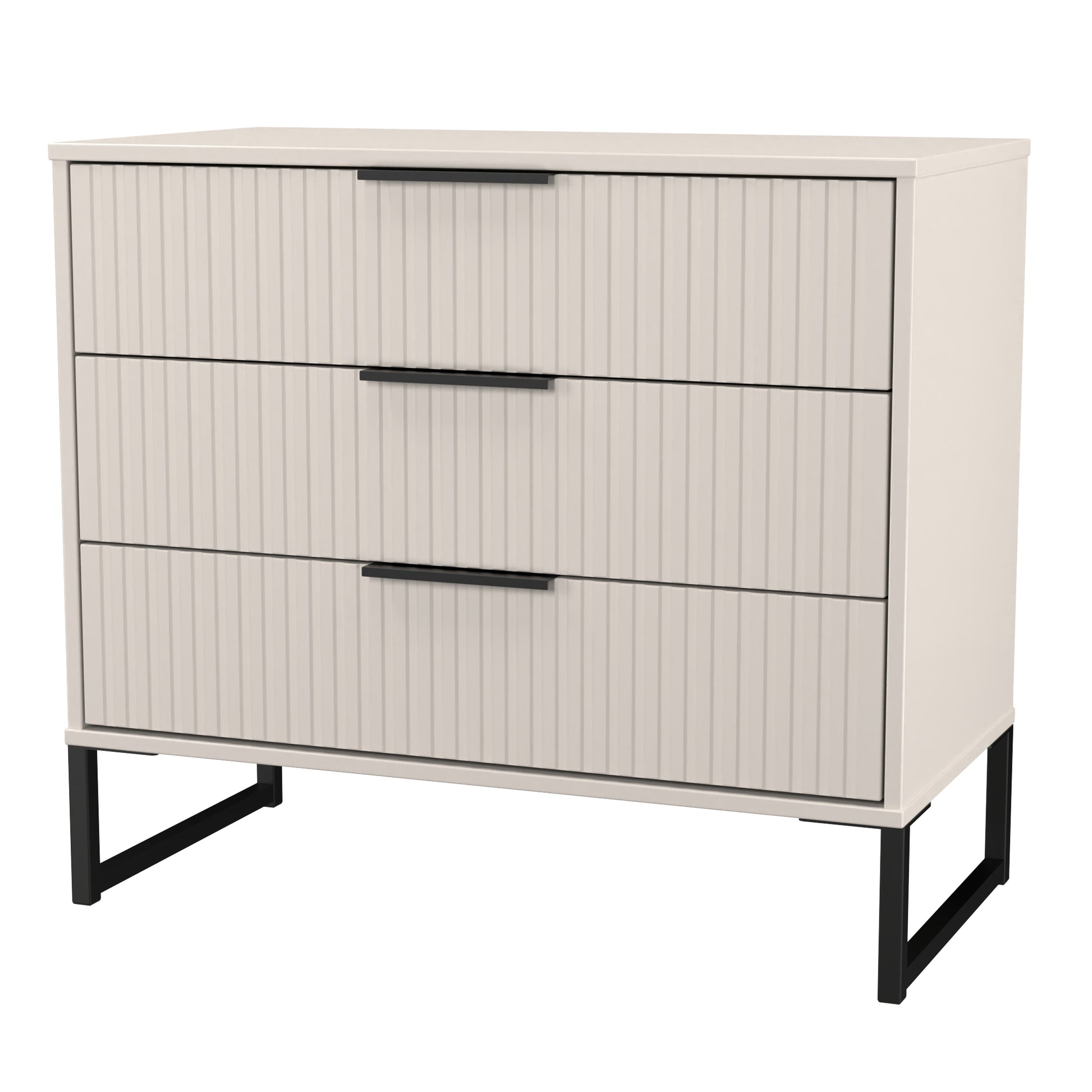 This wide 3 drawer chest of drawers is practical and stylish. Perfect for any home as a free standing storage unit. A new stand out range, with its new deep cut "fluted" grove patten of the drawer and door fronts. Featuring black metal handles and black sleigh legs. A striking and individual range that is perfect for the modern home. All our furniture is made to order in the United Kingdom, to the highest quality using responsibly sourced materials. It is delivered within 10 working days direct to your location of choice by one of our two man delivery teams, and comes fully assembled (although items with legs will have those legs removed during transit to avoid damage). Part of the Fluted Collection.