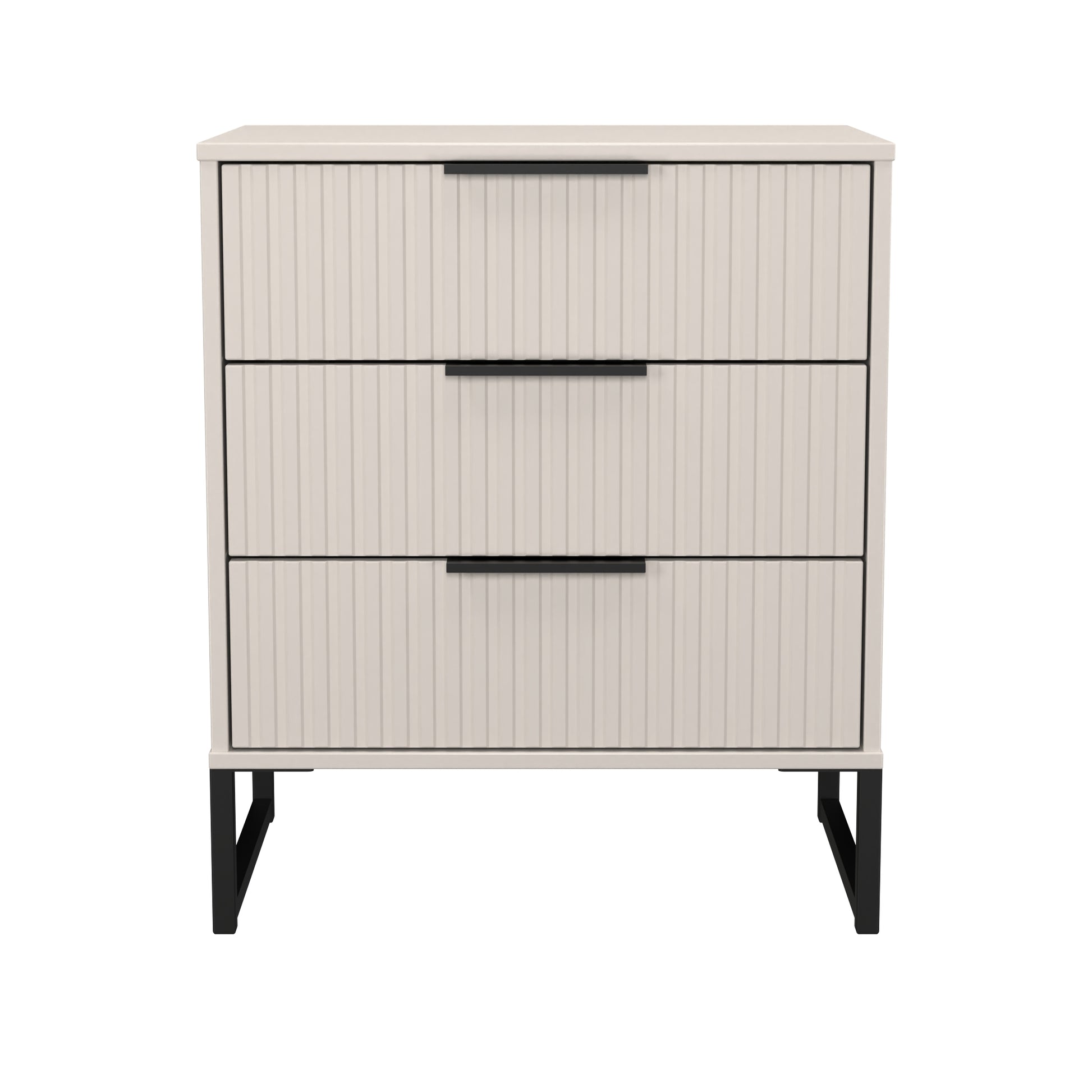 This 3 drawer bedside cabinet is wider than normal for added practicality. Perfect for any bedside or as a free standing storage unit. A new stand out range, with its new deep cut "fluted" grove patten of the drawer and door fronts. Featuring black metal handles and black sleigh legs. A striking and individual range that is perfect for the modern home. All our furniture is made to order in the United Kingdom, to the highest quality using responsibly sourced materials. It is delivered within 10 working days direct to your location of choice by one of our two man delivery teams, and comes fully assembled (although items with legs will have those legs removed during transit to avoid damage). Part of the Fluted Collection.