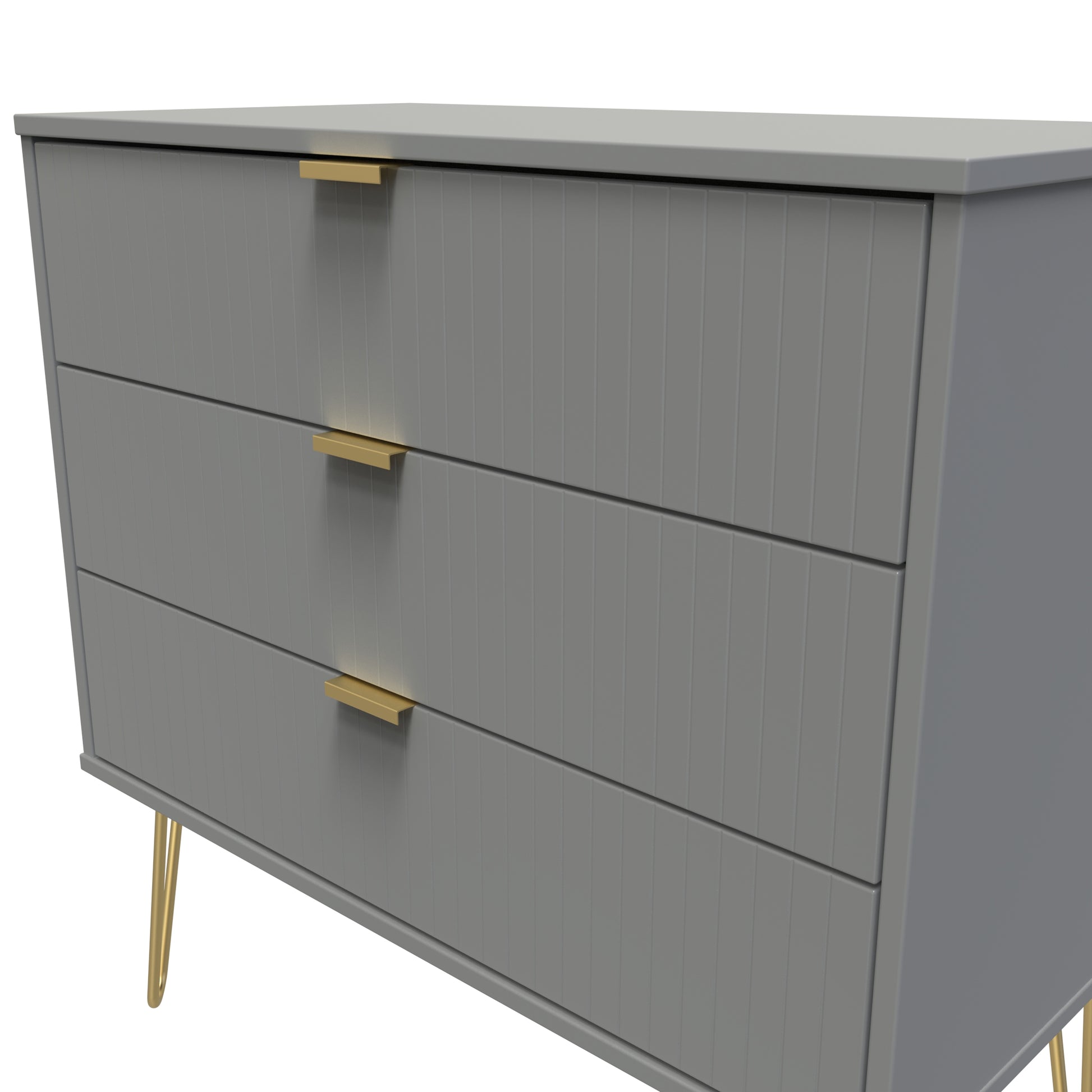 This wide 3 drawer chest of drawers is practical and stylish. Perfect for any home as a free standing storage unit. A modern and distinctive range. This ranges unique aesthetic is best represented by the distinctive "Linear" patten of the drawer and door fronts. Also features Gold Metal Handles and Gold Hairpin Legs. Comes in a wide range of colours including eye cathching two tone colour combinations. All our furniture is made to order in the United Kingdom, to the highest quality. It is delivered within 10 working days direct to your location of choice by one of our two man delivery teams, and comes fully assembled (although legs may be removed to prevent damage in transit). Part of the Linear Collection.
