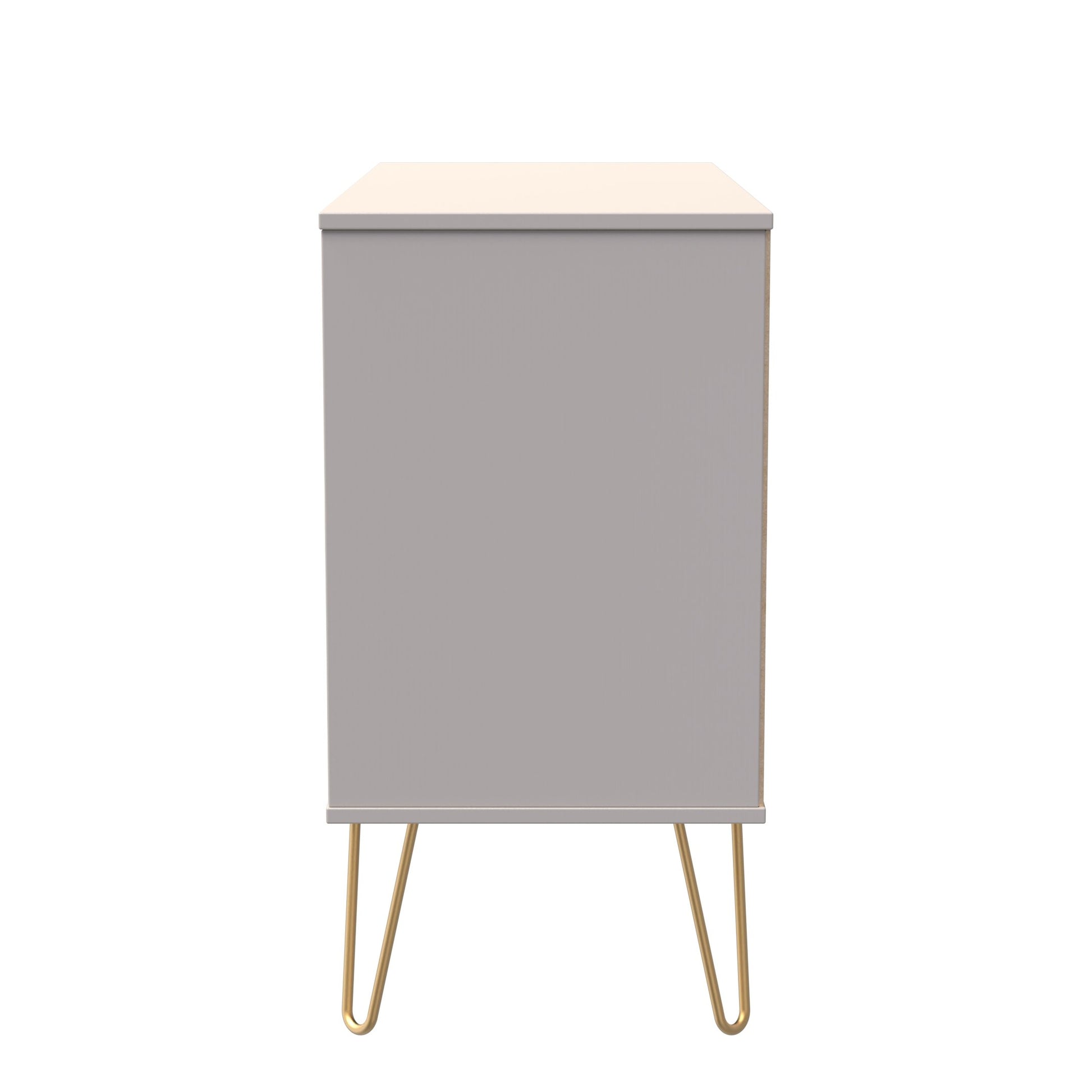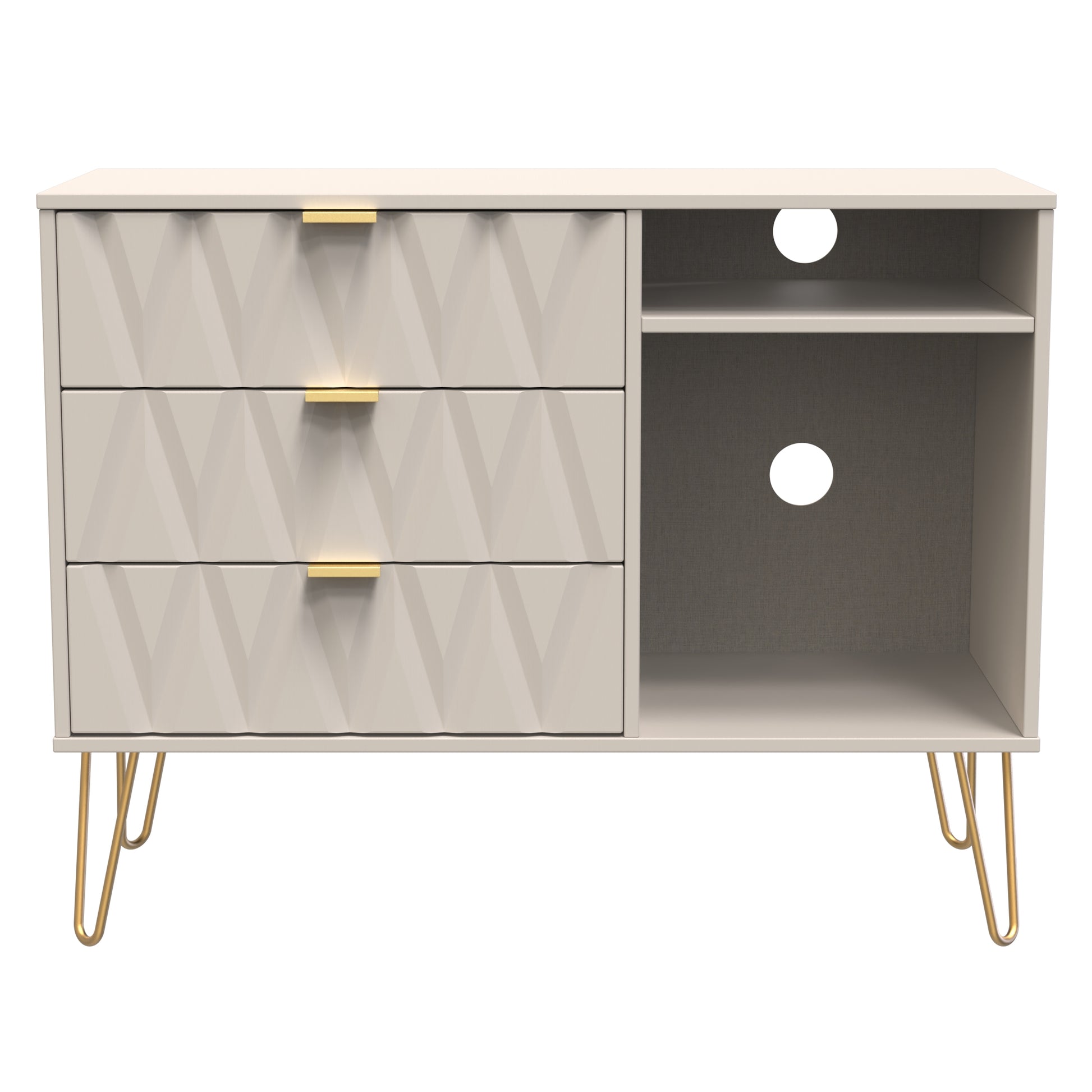 This modern storage unit features 3 drawers and a large storage area with a single shelf. Can be used as a TV/Media unit or sideboard. Say hello to contemporary cool with this modern range, with distinctive patterned drawers and a variety of colour options available to compliment any interior design. Gold metal handles and sturdy hairpin legs complete the storage solution. All our furniture is made to order in the United Kingdom, to the highest quality. It is delivered within 10 working days direct to your location of choice by one of our two man delivery teams, and comes fully assembled (although legs may be removed to prevent damage in transit). Part of the Diamond Collection.