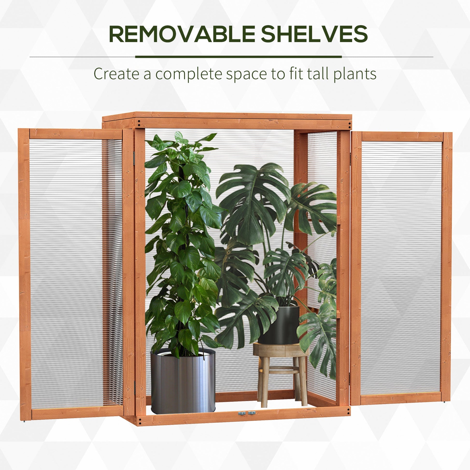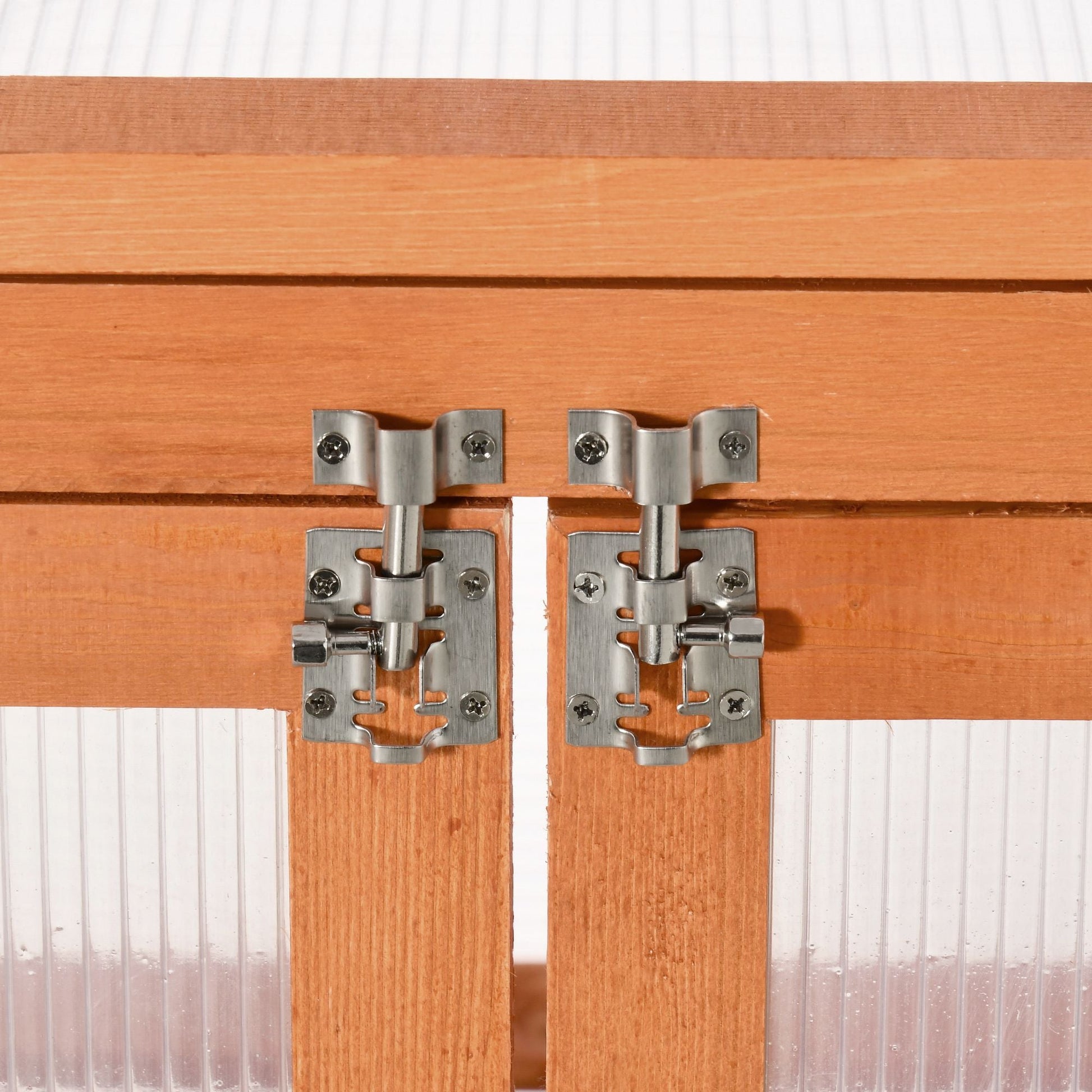 - Stylish and sturdy compact wooden design greenhouse • Fully equipped for outdoor use • Extend growing season and protect young plants from frost • Made from fir wood frame and polycarbonate panels • UV proof polycarbonate walls with flip-top hinged lid • With 2 slatted wood shelves for added storage space • 2 front opening doors • Galvanized metal parts for rust proofing • Assembly required