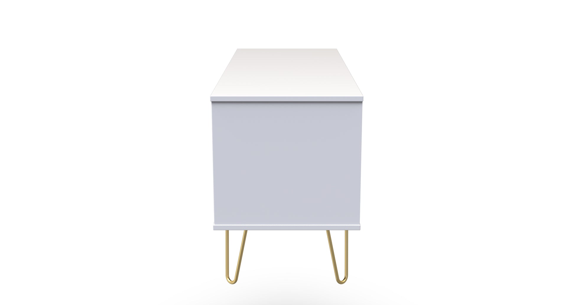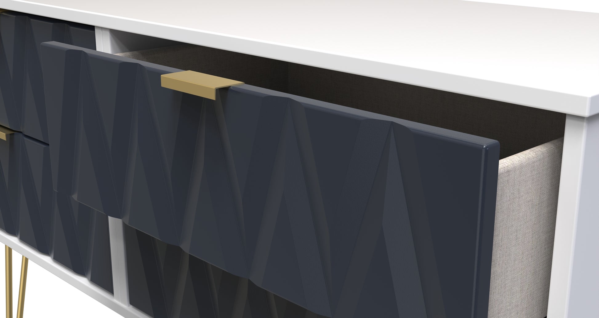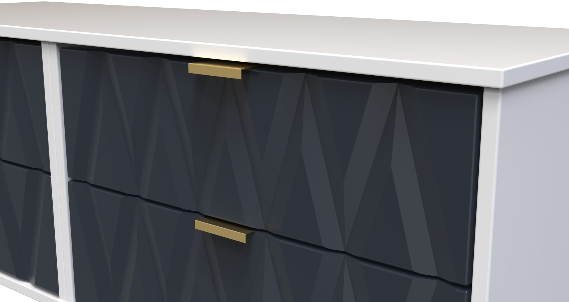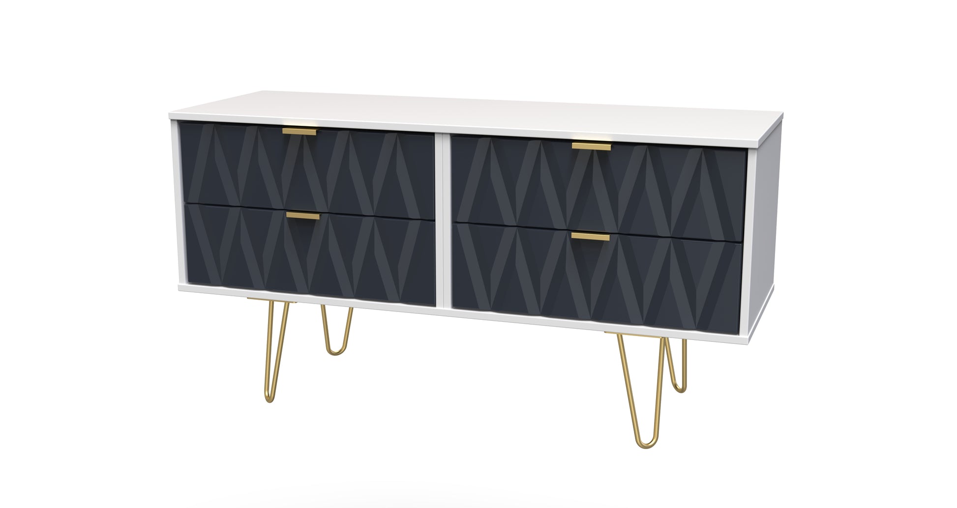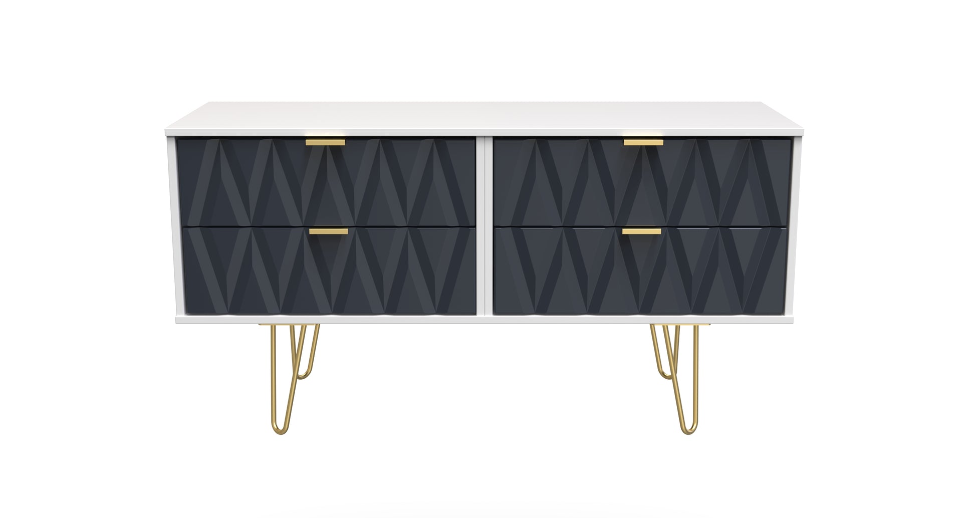 A large 4 drawer bed box. A Perfect storage solution for any room (not just the end of your bed). Could also be used as a low level TV/Media stand. Say hello to contemporary cool with this modern range, with distinctive patterned drawers and a variety of colour options available to compliment any interior design. Gold metal handles and sturdy hairpin legs complete the storage solution. All our furniture is made to order in the United Kingdom, to the highest quality. It is delivered within 10 working days direct to your location of choice by one of our two man delivery teams, and comes fully assembled (although legs may be removed to prevent damage in transit). Part of the Diamond Collection.