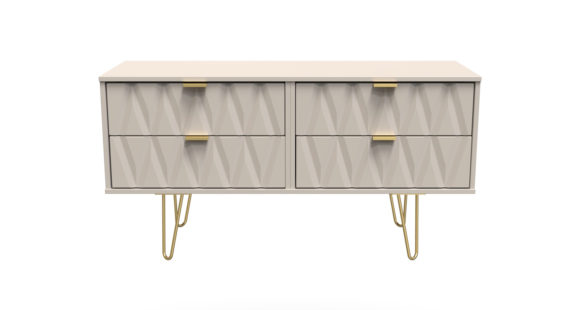 A large 4 drawer bed box. A Perfect storage solution for any room (not just the end of your bed). Could also be used as a low level TV/Media stand. Say hello to contemporary cool with this modern range, with distinctive patterned drawers and a variety of colour options available to compliment any interior design. Gold metal handles and sturdy hairpin legs complete the storage solution. All our furniture is made to order in the United Kingdom, to the highest quality. It is delivered within 10 working days direct to your location of choice by one of our two man delivery teams, and comes fully assembled (although legs may be removed to prevent damage in transit). Part of the Diamond Collection.