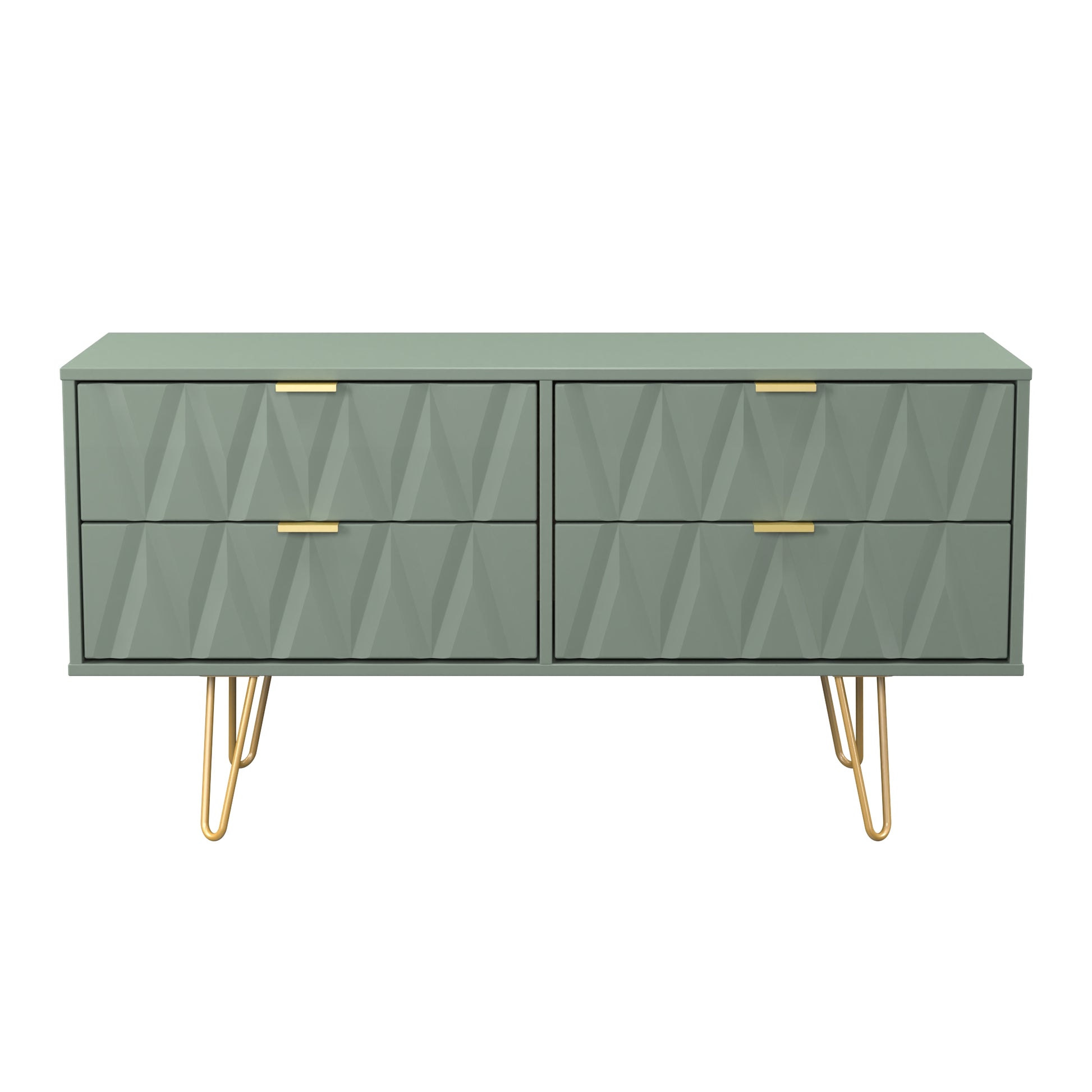 A large 4 drawer bed box. A Perfect storage solution for any room (not just the end of your bed). Could also be used as a low level TV/Media stand. Say hello to contemporary cool with this modern range, with distinctive patterned drawers and a variety of colour options available to compliment any interior design. Gold metal handles and sturdy hairpin legs complete the storage solution. All our furniture is made to order in the United Kingdom, to the highest quality. It is delivered within 10 working days direct to your location of choice by one of our two man delivery teams, and comes fully assembled (although legs may be removed to prevent damage in transit). Part of the Diamond Collection.