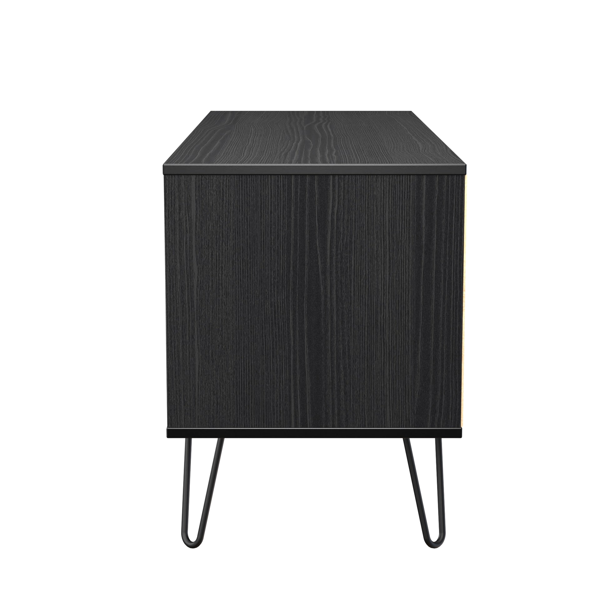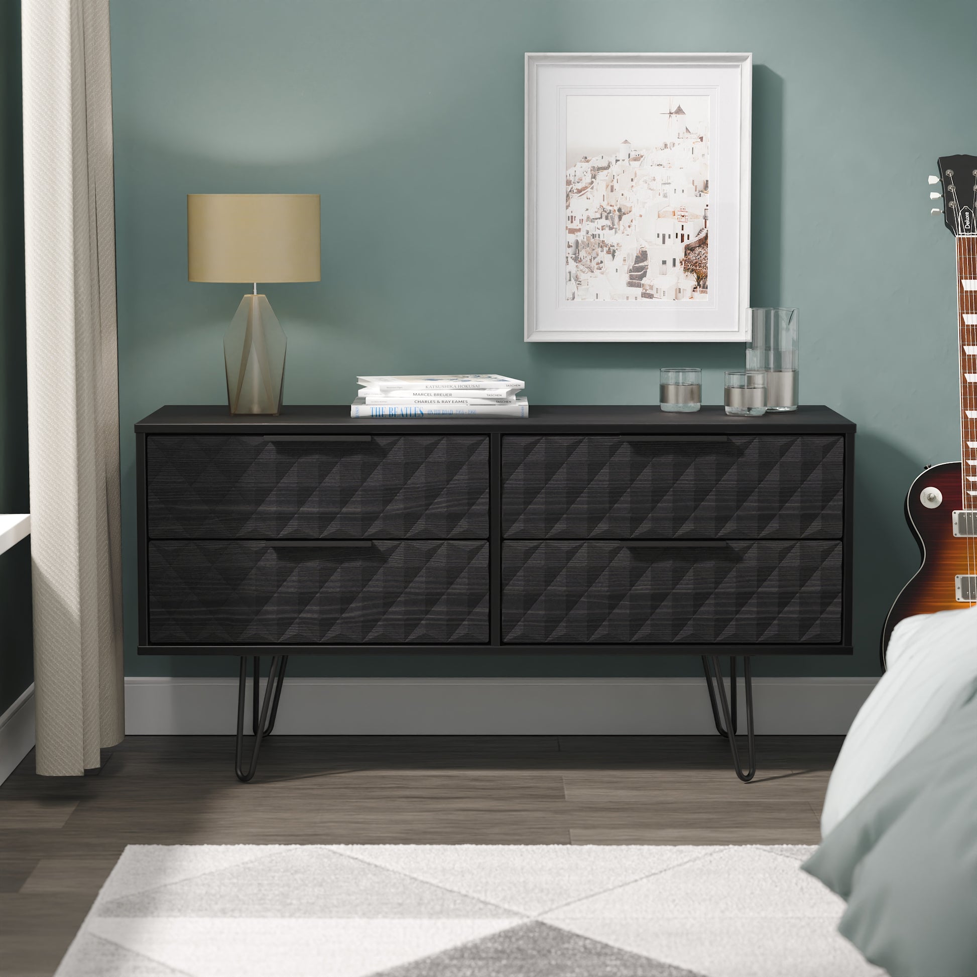 A large 4 drawer bed box. A Perfect storage solution for any room (not just the end of your bed). Could also be used as a low level TV/Media stand. A modern and distinctive range. This ranges unique aesthetic is best represented by the distinctive "Harlequin" patten of the drawer and door fronts. Also features Black Metal Handles and Black Hairpin Legs. Comes in a wide range of colours including eye cathching two tone colour combinations. All our furniture is made to order in the United Kingdom, to the highest quality using responsibly sourced materials. It is delivered within 10 working days direct to your location of choice by one of our two man delivery teams, and comes fully assembled (although items with legs will have those legs removed during transit to avoid damage). Part of the Harlequin Collection.