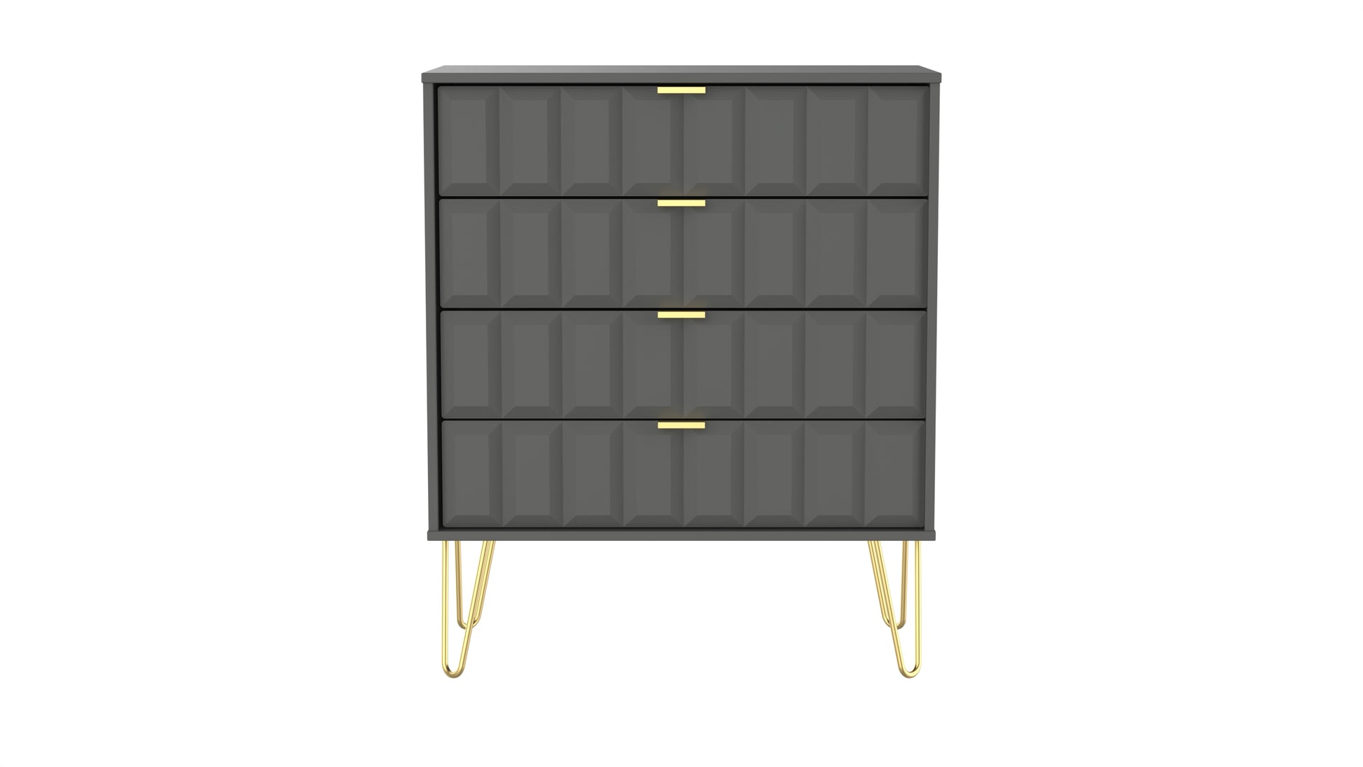 This wide 4 drawer chest of drawers is practical and stylish. Perfect for any home as a free standing storage unit. A modern and distinctive range. This ranges unique aesthetic is best represented by the distinctive "Cube" patten of the drawer and door fronts. Also features Gold Metal Handles and Gold Hairpin Legs. Comes in a wide range of colours including eye cathching two tone colour combinations. All our furniture is made to order in the United Kingdom, to the highest quality. It is delivered within 10 working days direct to your location of choice by one of our two man delivery teams, and comes fully assembled (although legs may be removed to prevent damage in transit). Part of the Cube Collection.