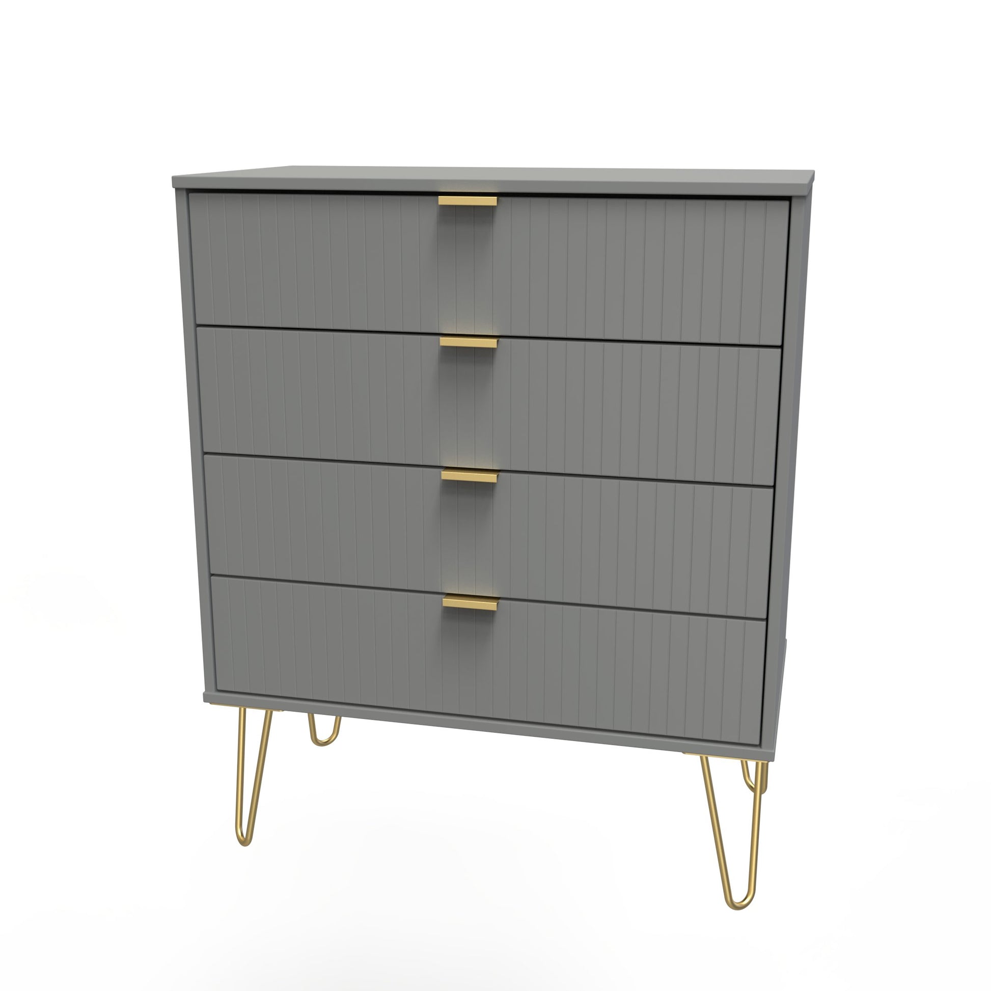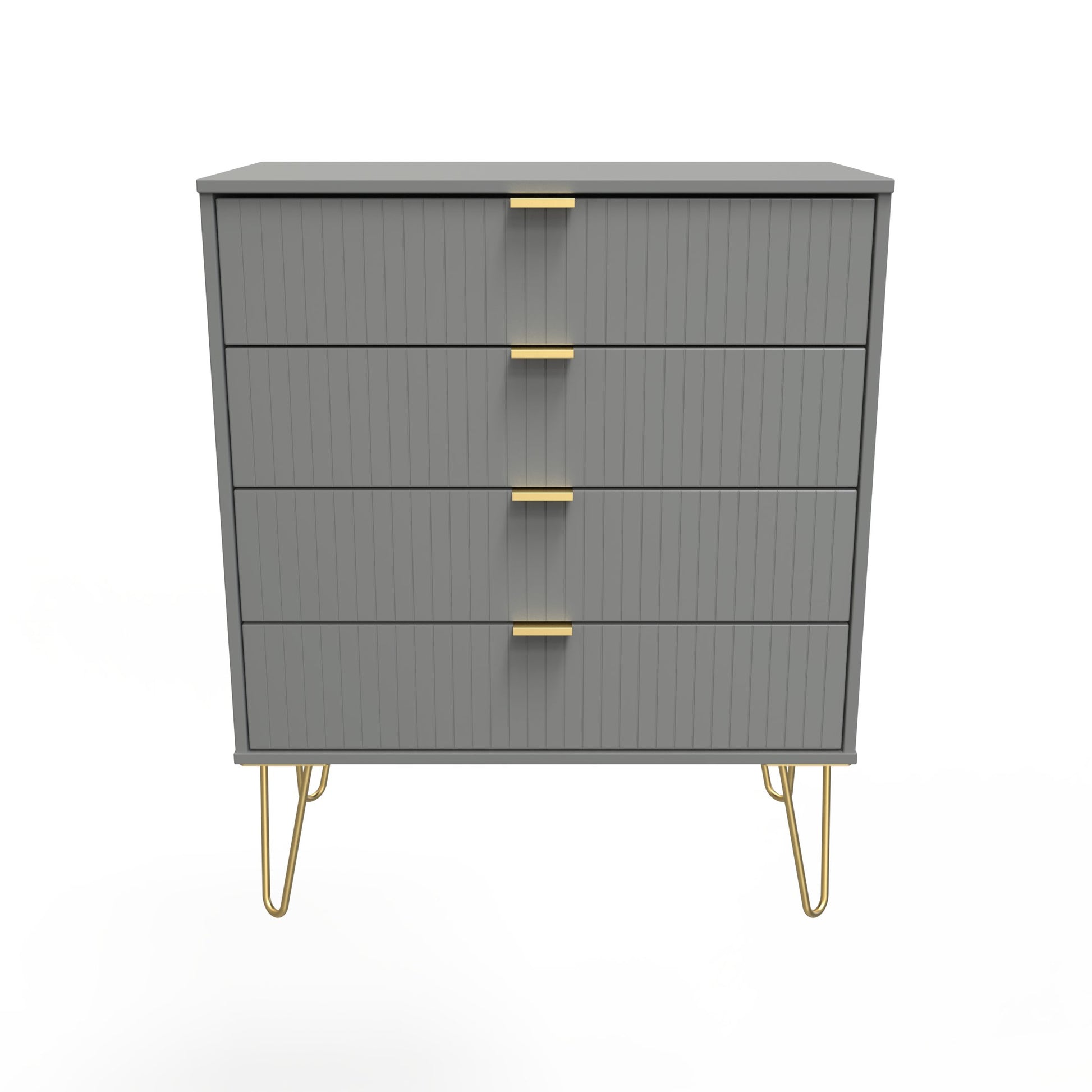 This wide 4 drawer chest of drawers is practical and stylish. Perfect for any home as a free standing storage unit. A modern and distinctive range. This ranges unique aesthetic is best represented by the distinctive "Linear" patten of the drawer and door fronts. Also features Gold Metal Handles and Gold Hairpin Legs. Comes in a wide range of colours including eye cathching two tone colour combinations. All our furniture is made to order in the United Kingdom, to the highest quality. It is delivered within 10 working days direct to your location of choice by one of our two man delivery teams, and comes fully assembled (although legs may be removed to prevent damage in transit). Part of the Linear Collection.