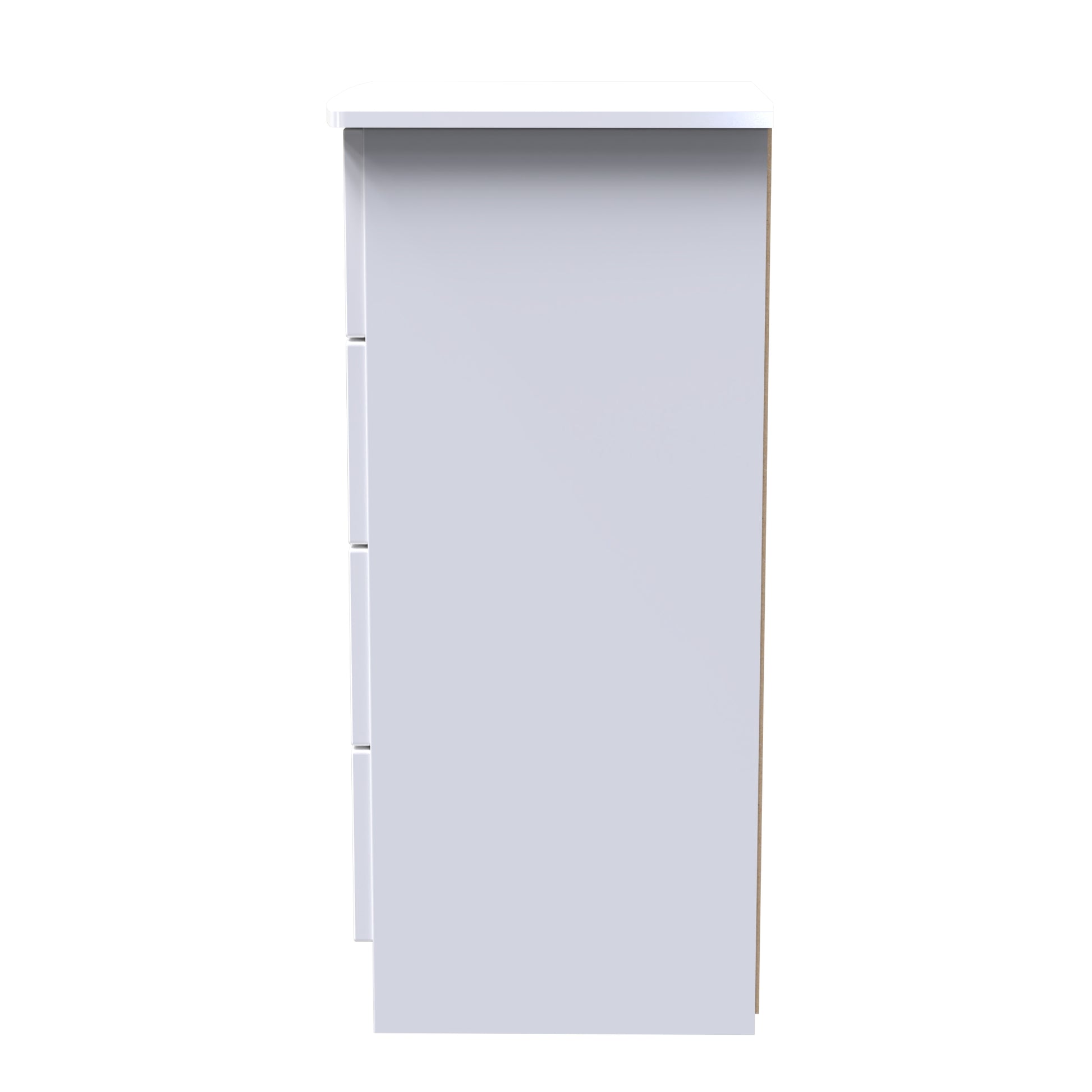 This 4 drawer tall bedside cabinet is practical and stylish. Perfect for any bedside or as a free standing storage unit. Boasting a clean, contemporary look and pleasing practicality, the furniture range makes a seamless addition to any modern looking home. The range offers an array of practical, organised space for items both large and small that will help keep your room neat and tidy. All pieces have a scratch-resistant veneer to help prevent the wear and tear that can come with everyday usage, while the extensive colour options of the drawers and doors is complemented by distinctive cut-out handles and a smooth finish for a great mix of style and functionality. All our furniture is made to order in the United Kingdom, to the highest quality. It is delivered within 10 working days direct to your location of choice by one of our two man delivery teams, and comes fully assembled (although legs may be removed to prevent damage in transit). Part of the Camden Collection.