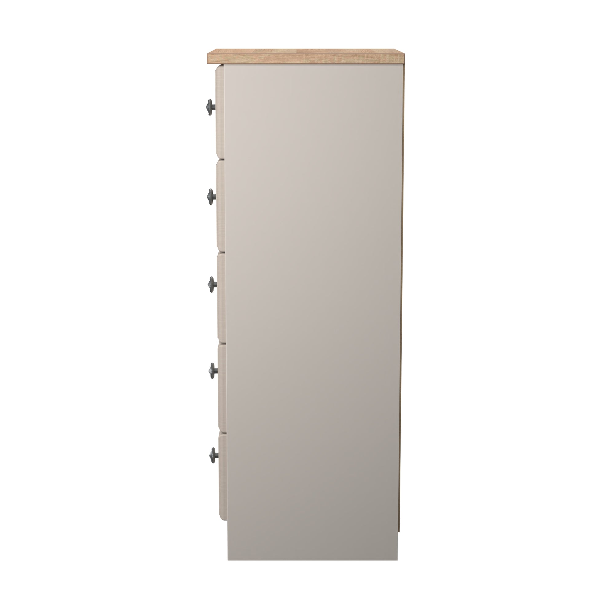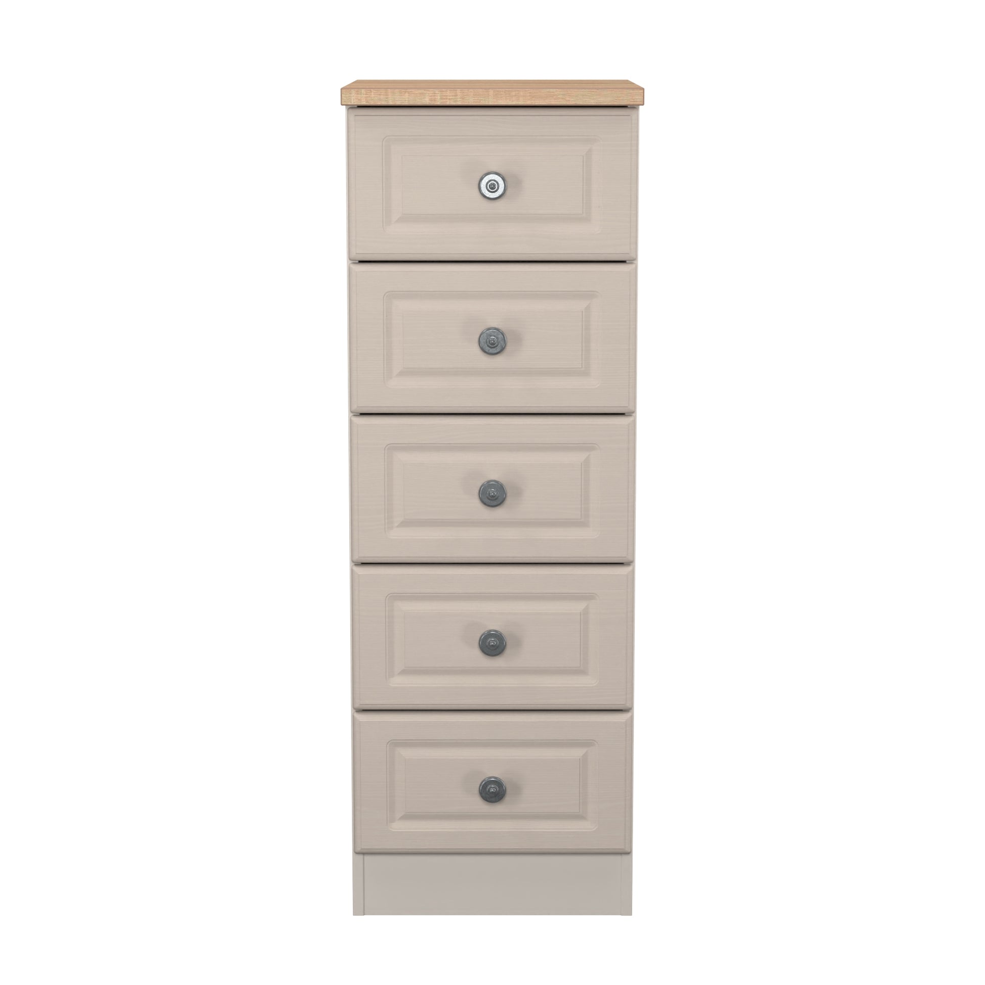 This 5 drawer chest of drawers is practical and stylish. Perfect for any home as a free standing storage unit. This classic range uses traditional edge finishes and wood effect tops, to create a range of classic looking furniture pieces. Contrasting finishes create the tonal variations seen here with brushed steel handle mounted on wood grained fronts. All our furniture is made to order in the United Kingdom, to the highest quality. It is delivered within 10 working days direct to your location of choice by one of our two man delivery teams, and comes fully assembled - Please Note that any handles or legs may be removed durning transit to avoid the risk of damage. Part of the Norfolk Collection.